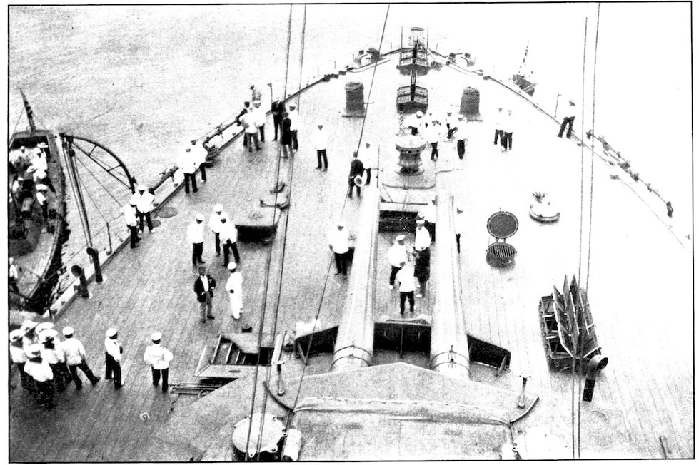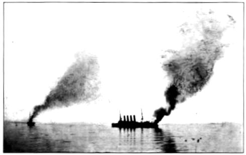 Toga awaited him there; at what particular point is immaterial, for the Straits are but sixty miles wide, which space is halved by the Island of Tsushima, whence the Straits have the alternate name—Tsushima. In such narrow waters, wherever the Japanese Admiral might be, he was certain, by an extensive scouting system, to receive notice timely enough to ensure intercepting his enemy. The notice came by wireless telegraphy early on Saturday, May 27, from cruisers off Quelpaert Island, 150 miles southwest of Tsushima; and as the Russian fleet, heading for Vladivostok, drew up with Tsushima, the Japanese battleships were seen rounding its northern point. As regards the position of the Russian ships, it seems certain, that, upon sighting the enemy, they formed in two columns of vessels. One contained the armored ships, a very heterogeneous assembly in size and qualities, composed of battleships of the first and second class, armored cruisers, and coast-defence ironclads. The second column was of lighter cruisers. This took the left hand, toward Tsushima, while the battleships were on the right, toward Japan. At the head of the battle column were three battleships; two of the first order of strength, 13,516 tons, the third of 10,000 tons, between them.
