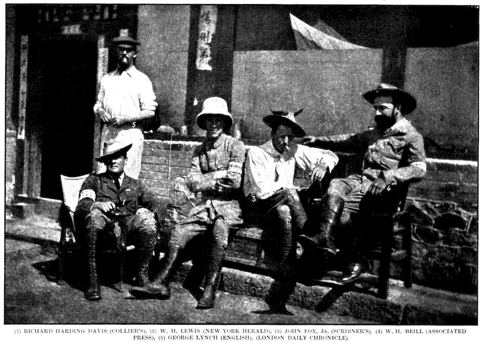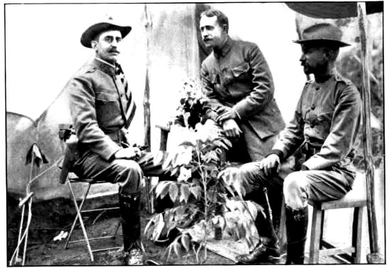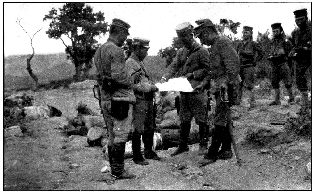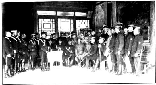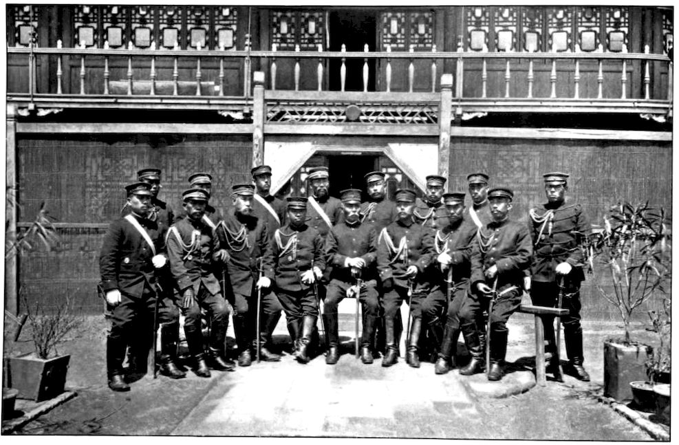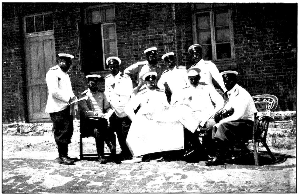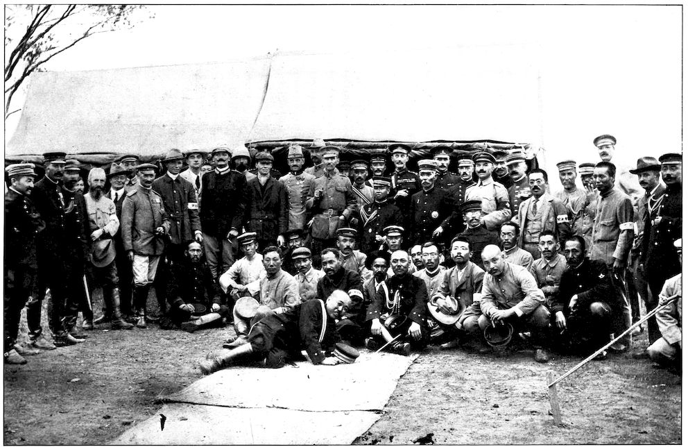General Nogi sits in the centre, the gray-bearded man with the round decoration on his breast. On his right is General Ijichi, his chief of staff, who conducted the negotiations for the surrender. On Ijichi’s right is the Surgeon-General of the Third Army, and beyond, with the beard and many decorations, is Major Arriga, Japan’s greatest expert on international law