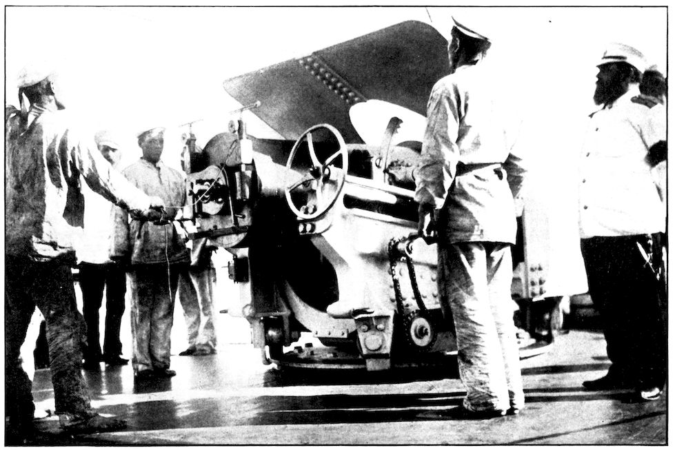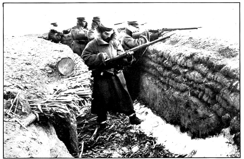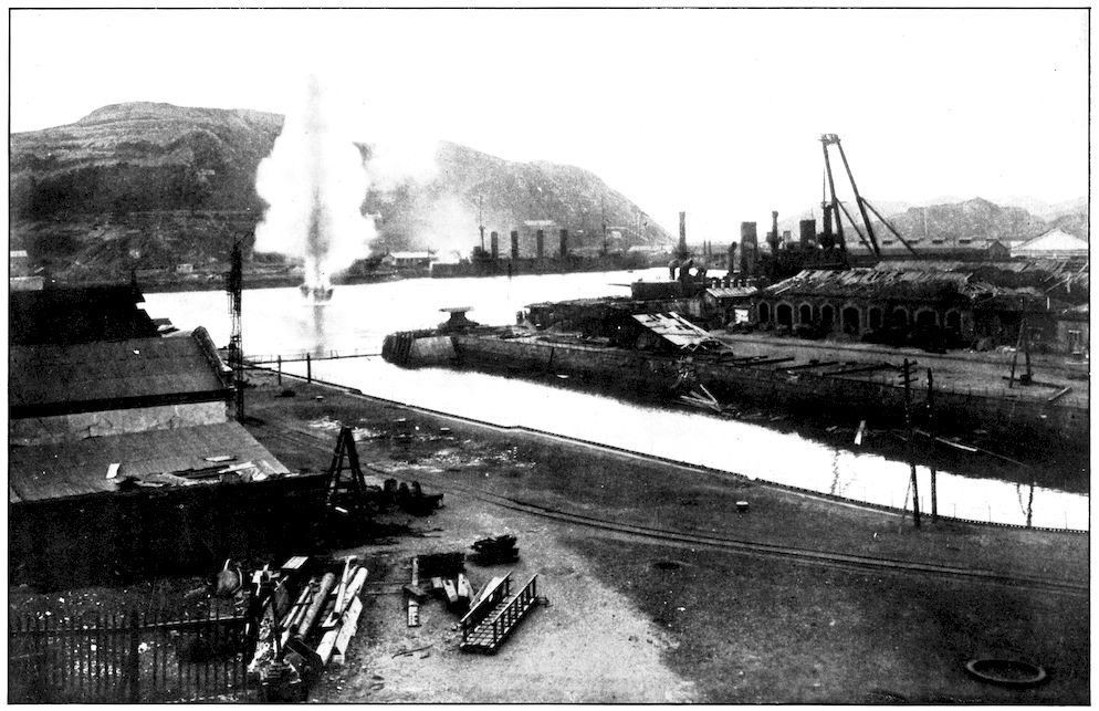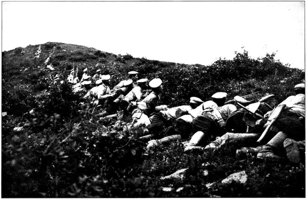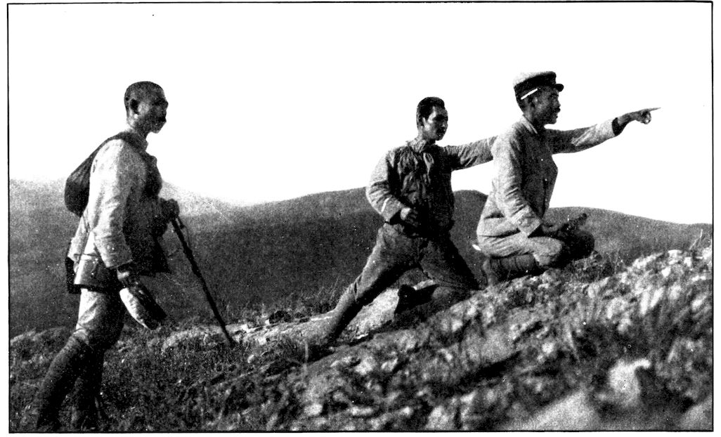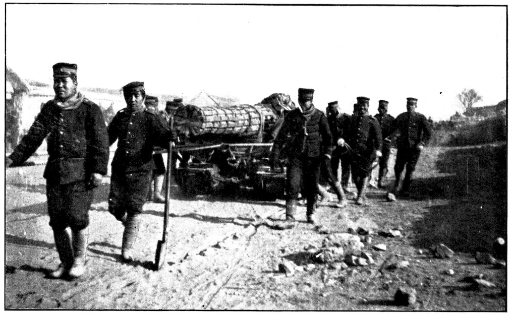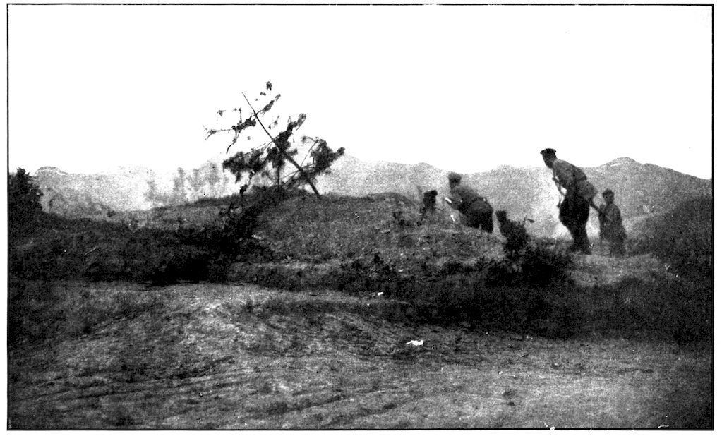 From the outer line of defence at Nanshan, and thirty miles from the town, the Japanese worked their way literally inch by inch, burrowing underground, digging deep trenches that zig-zagged toward the enemy’s lines, until near enough to make a rush. In many places the ground was solid rock and countermining was impossible. Barbed-wire entanglements covered the country for miles, and wide stretches of bare ground had been covered a foot deep with powdered white ash, which stirred into a thick white cloud when trodden on, so as to make a splendid target for machine guns. There were buried mines, some to explode automatically, others to explode when the lookout man in a distant fort pressed a button. At night searchlights flashed across every yard of the country near the lines of forts, and sometimes the Russian gunboats creeping along the shore outside the harbor got far enough to pour a cross-fire into the Japanese encampments. Day and night Togo’s squadron sent in from long range the terrible Shimose shells, worse than lyddite, on the battered town and forts. Where it was impossible to tunnel or burrow, masses of rock and bags full of sand were rushed forward at night to make a temporary shelter where a regiment could go forward a hundred yards, rest, fire for a few minutes, and advance another hundred yards, until at last they were close to the enemy. Then, in the teeth of fierce rifle fire, reinforced, perhaps, by shells from the other forts, the final charge was made.