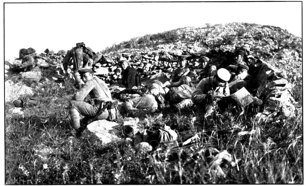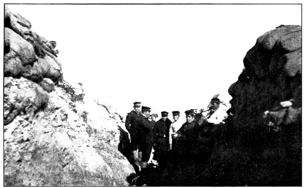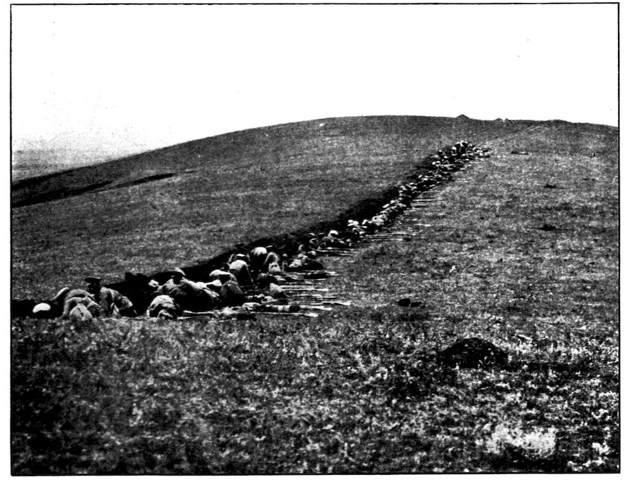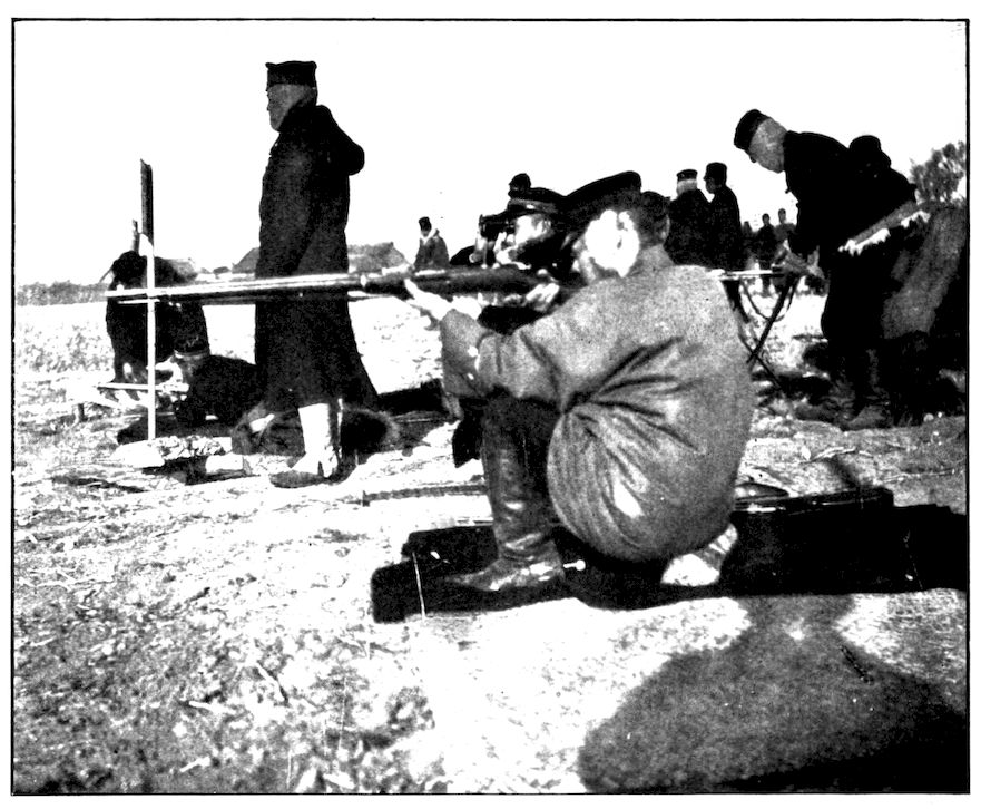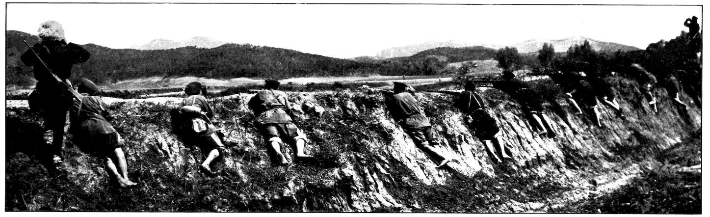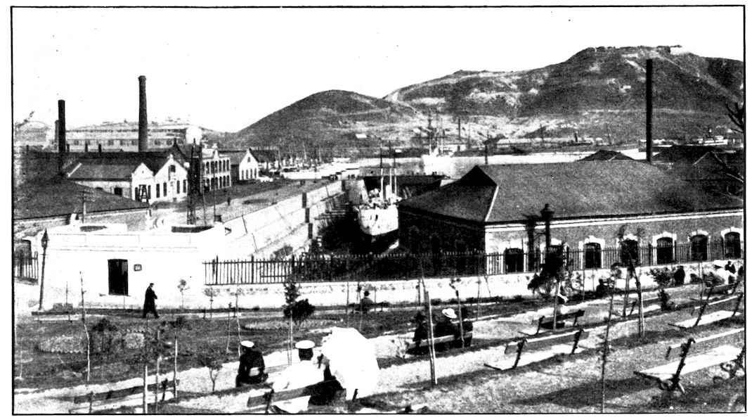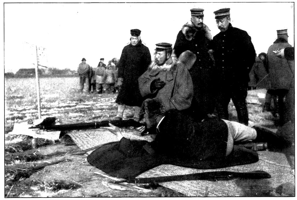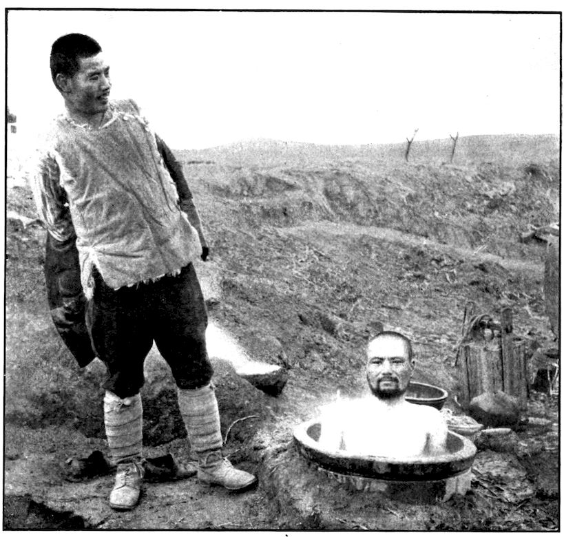 From the outer line of defence at Nanshan, and thirty miles from the town, the Japanese worked their way literally inch by inch, burrowing underground, digging deep trenches that zig-zagged toward the enemy’s lines, until near enough to make a rush. In many places the ground was solid rock and countermining was impossible. Barbed-wire entanglements covered the country for miles, and wide stretches of bare ground had been covered a foot deep with powdered white ash, which stirred into a thick white cloud when trodden on, so as to make a splendid target for machine guns. There were buried mines, some to explode automatically, others to explode when the lookout man in a distant fort pressed a button. At night searchlights flashed across every yard of the country near the lines of forts, and sometimes the Russian gunboats creeping along the shore outside the harbor got far enough to pour a cross-fire into the Japanese encampments. Day and night Togo’s squadron sent in from long range the terrible Shimose shells, worse than lyddite, on the battered town and forts. Where it was impossible to tunnel or burrow, masses of rock and bags full of sand were rushed forward at night to make a temporary shelter where a regiment could go forward a hundred yards, rest, fire for a few minutes, and advance another hundred yards, until at last they were close to the enemy. Then, in the teeth of fierce rifle fire, reinforced, perhaps, by shells from the other forts, the final charge was made.