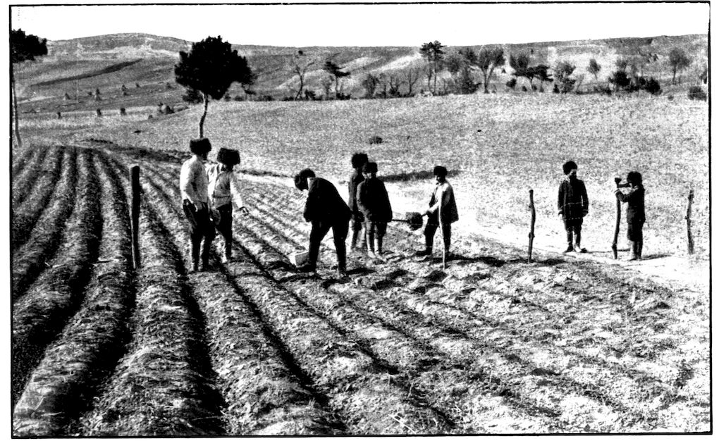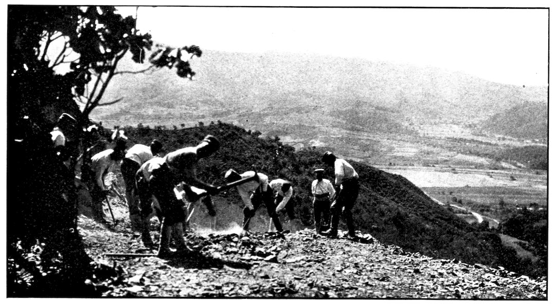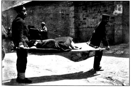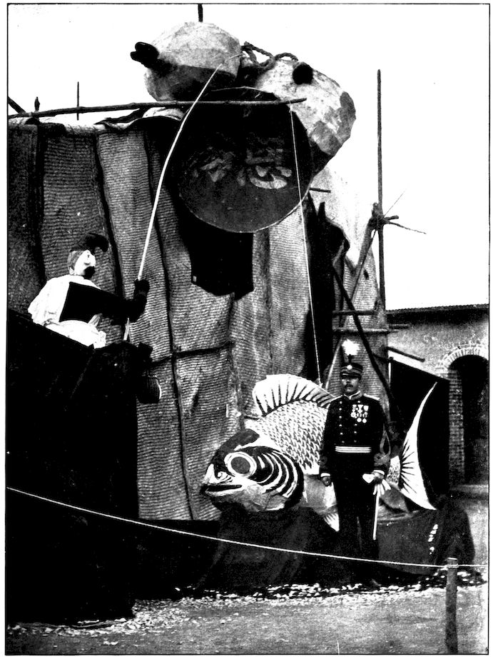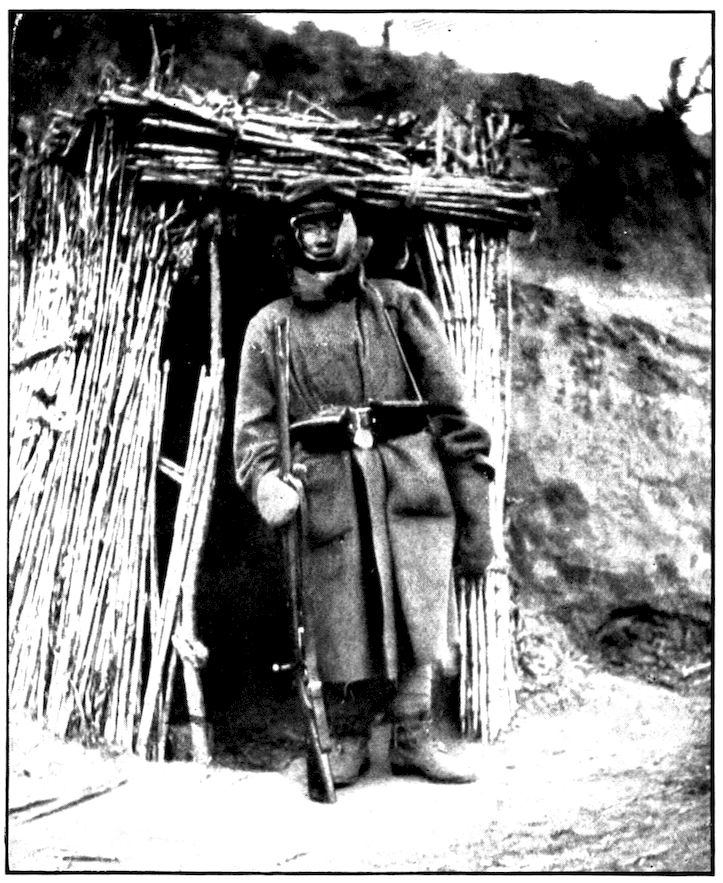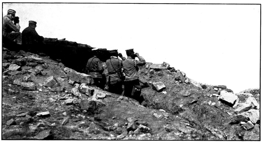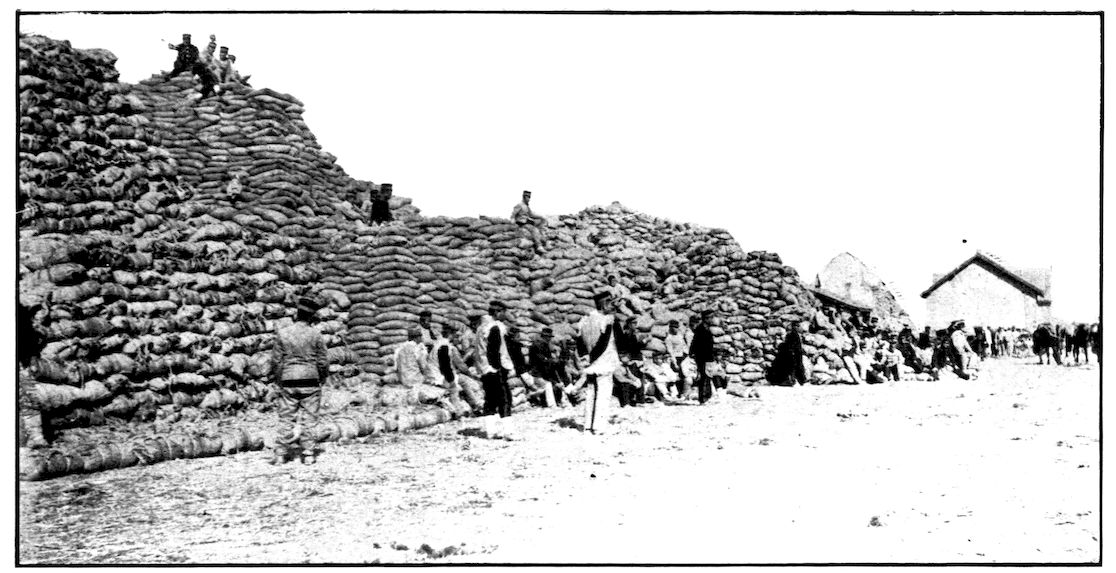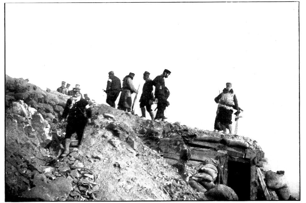 From the outer line of defence at Nanshan, and thirty miles from the town, the Japanese worked their way literally inch by inch, burrowing underground, digging deep trenches that zig-zagged toward the enemy’s lines, until near enough to make a rush. In many places the ground was solid rock and countermining was impossible. Barbed-wire entanglements covered the country for miles, and wide stretches of bare ground had been covered a foot deep with powdered white ash, which stirred into a thick white cloud when trodden on, so as to make a splendid target for machine guns. There were buried mines, some to explode automatically, others to explode when the lookout man in a distant fort pressed a button. At night searchlights flashed across every yard of the country near the lines of forts, and sometimes the Russian gunboats creeping along the shore outside the harbor got far enough to pour a cross-fire into the Japanese encampments. Day and night Togo’s squadron sent in from long range the terrible Shimose shells, worse than lyddite, on the battered town and forts. Where it was impossible to tunnel or burrow, masses of rock and bags full of sand were rushed forward at night to make a temporary shelter where a regiment could go forward a hundred yards, rest, fire for a few minutes, and advance another hundred yards, until at last they were close to the enemy. Then, in the teeth of fierce rifle fire, reinforced, perhaps, by shells from the other forts, the final charge was made.