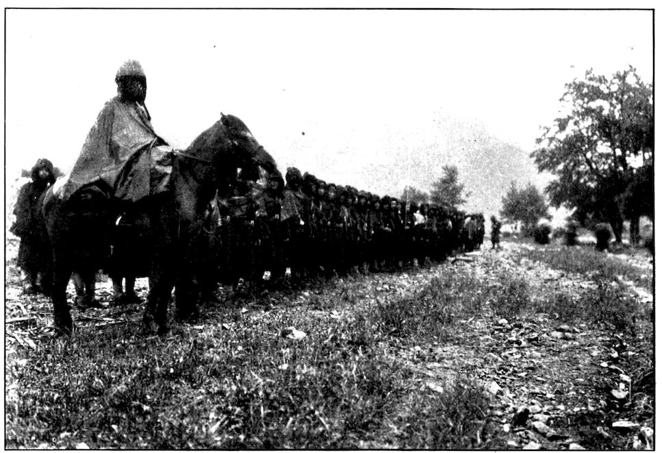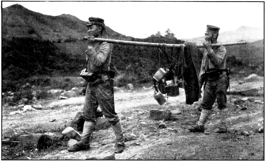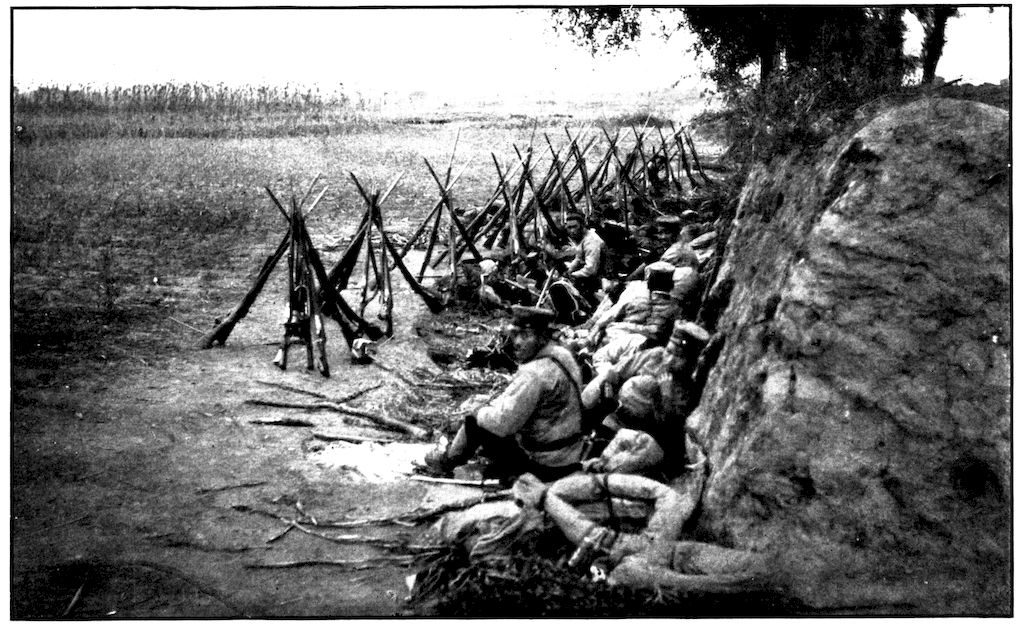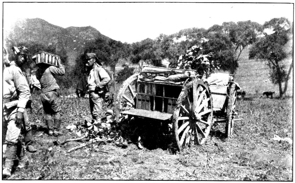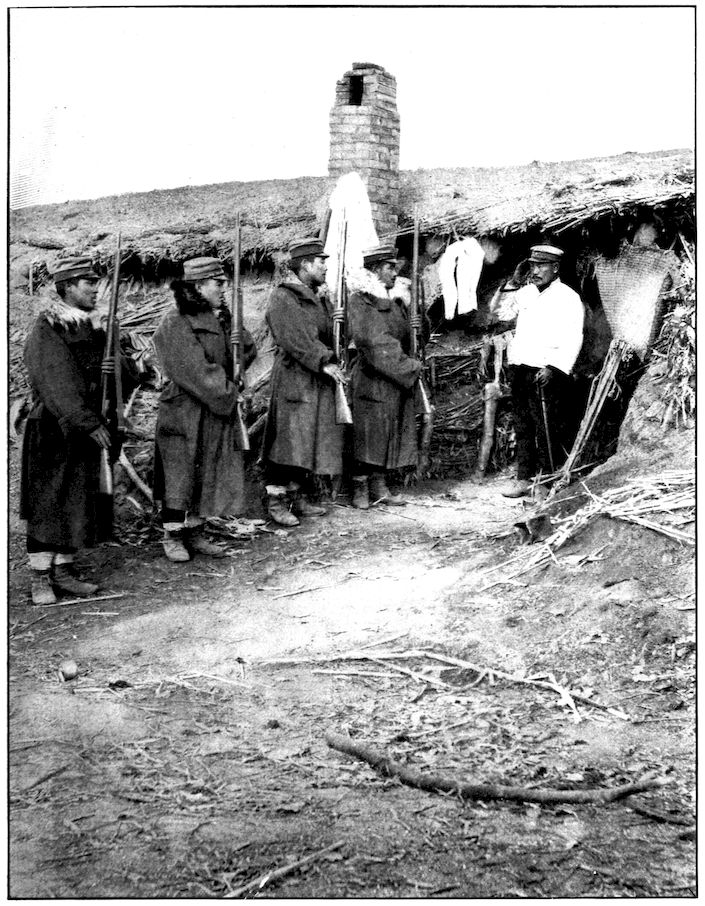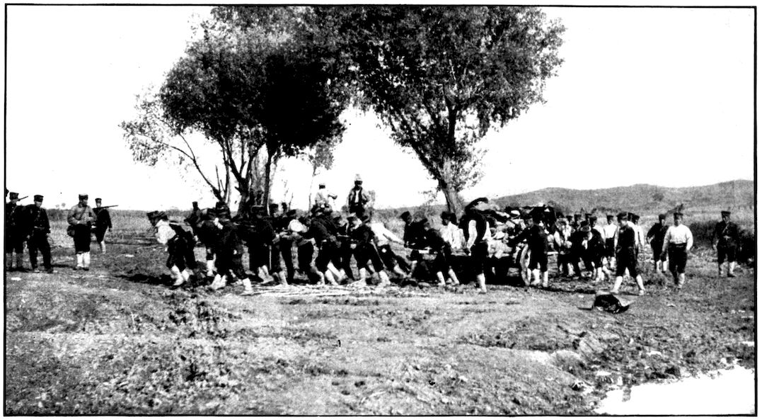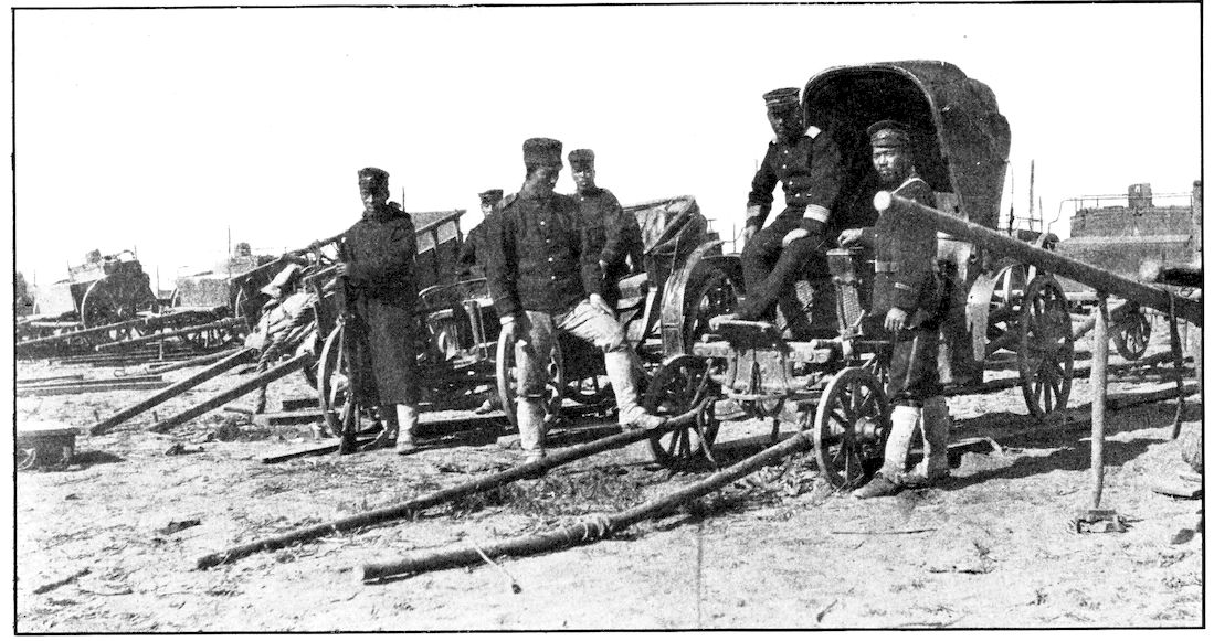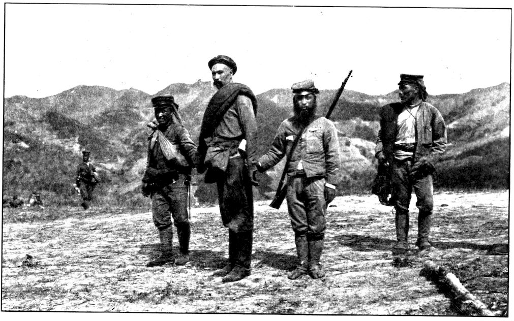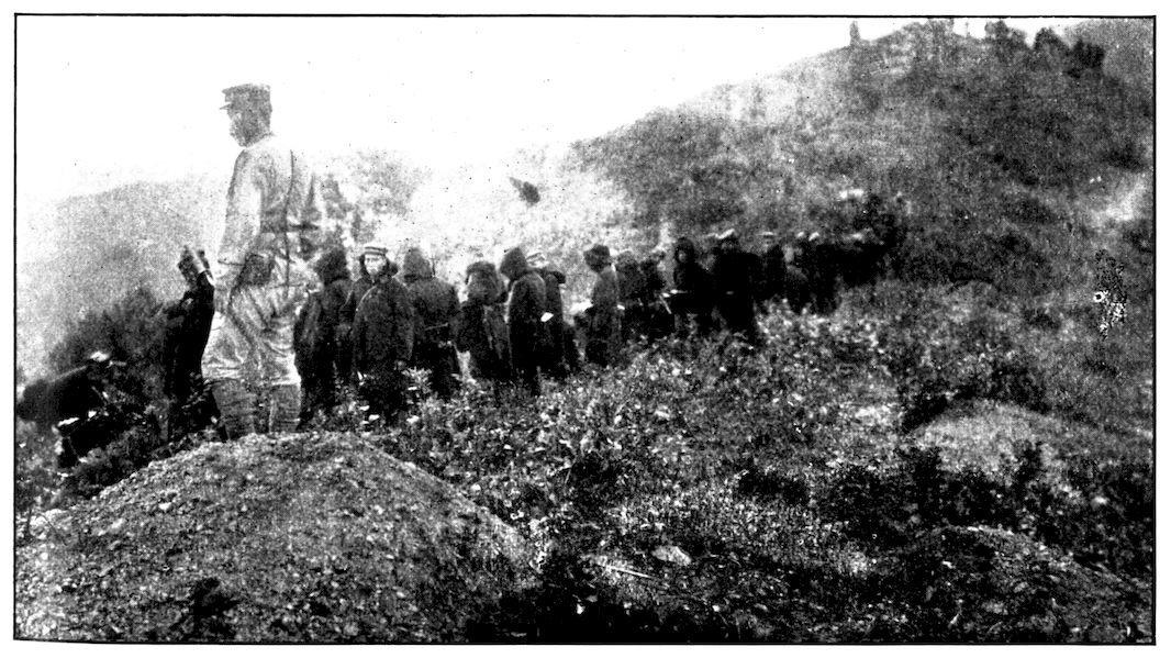 All the battalions were full before the battle. There was not one that did not lose at least ten or fifteen per cent of its quota—as the gaps in the ranks show. Kuroki’s army during the closing-in movement on Mukden was between Nodzu’s and Kawamura’s, the latter being on the extreme right wing. This photograph was taken by Frederick Palmer, Collier’s special correspondent