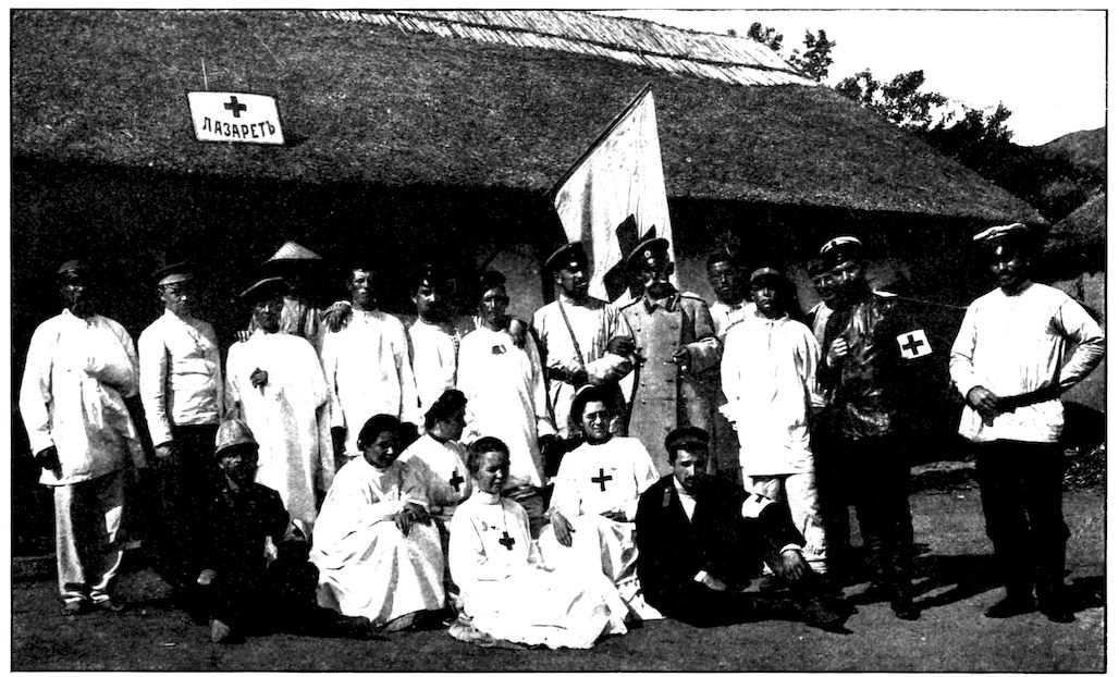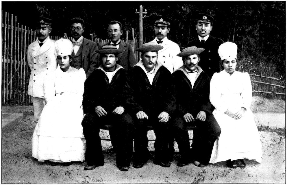 CONVALESCENT WOUNDED RUSSIAN SAILORS AND THEIR JAPANESE NURSES AND DOCTORS AT MATSUYAMA
