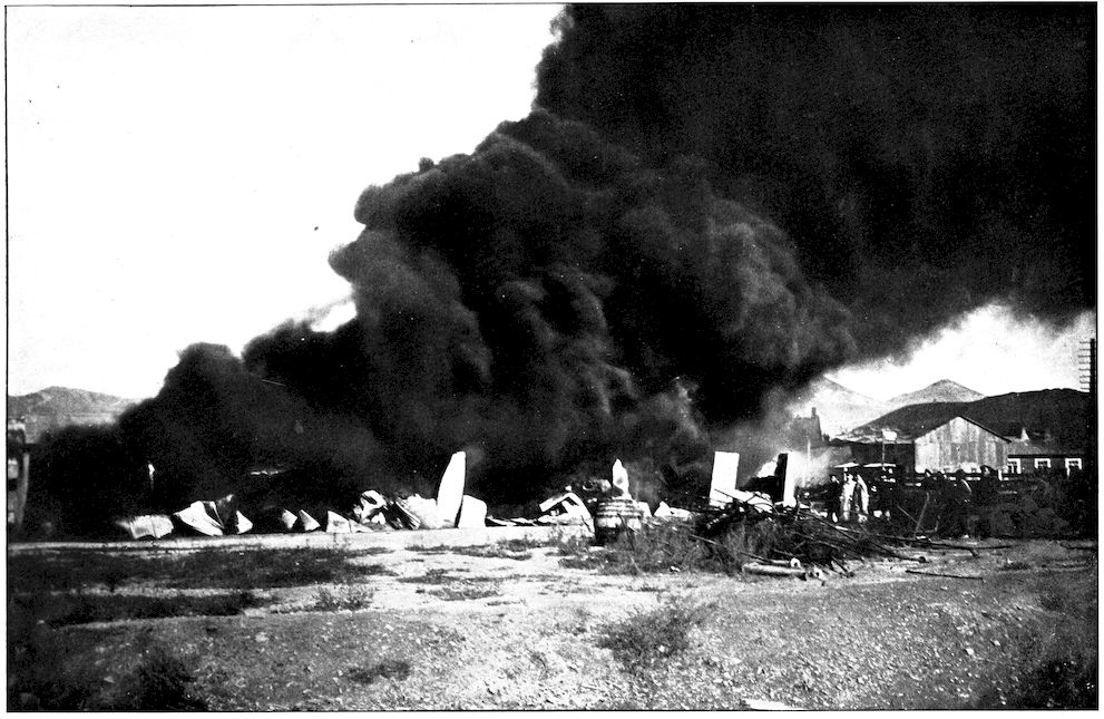 ENGINEERS’ STORES, SET ON FIRE BY JAPANESE SHELLS, BURNING AT PORT ARTHUR