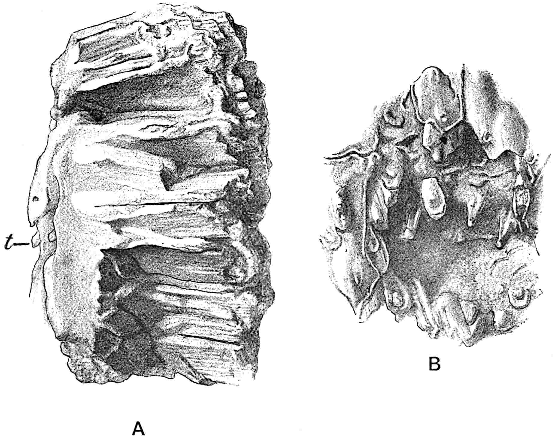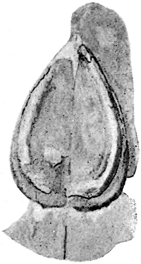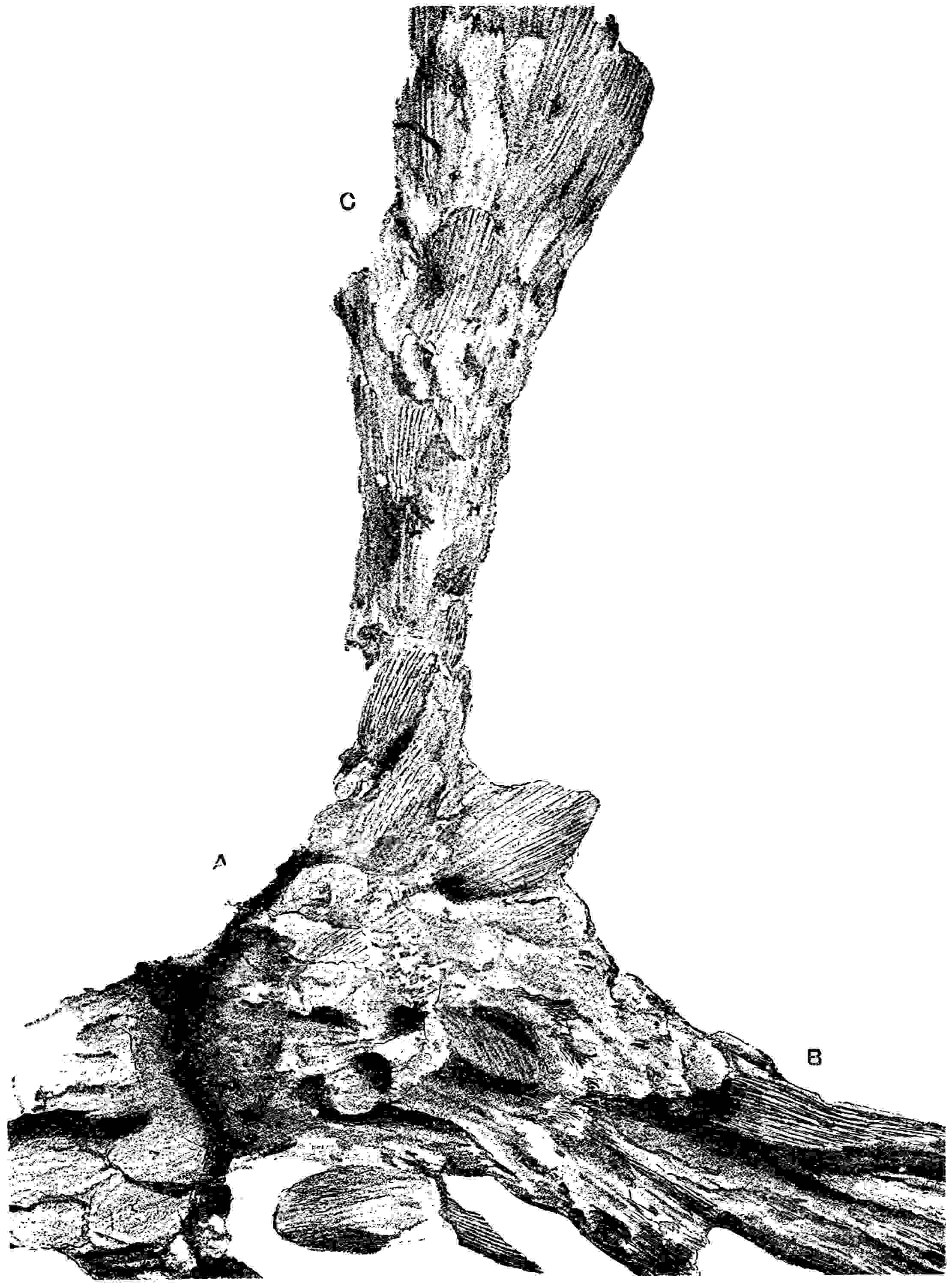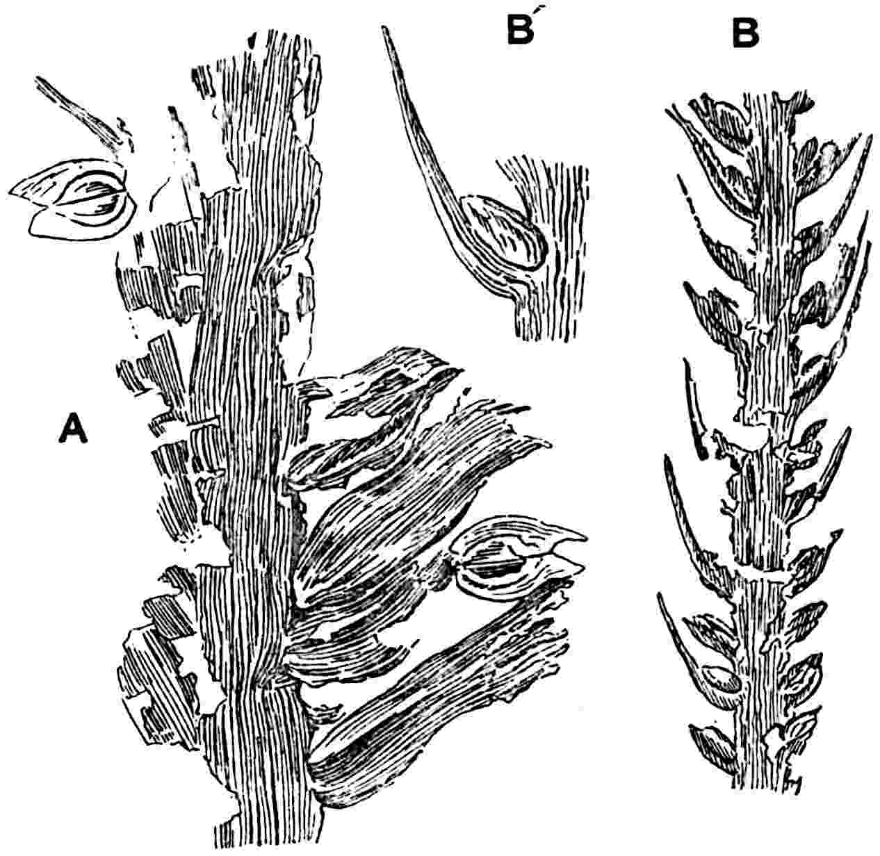 The employment of this generic name may serve a useful purpose if used for specimens, whether preserved as petrifactions or impressions, believed to be portions of Cycadean frond-axes, but which in the absence of pinnae cannot be assigned to one of the recognised genera of fronds. Saporta[1770] describes two species from Kimmeridgian beds in France, Cycadorachis abscissa and C. armata: the first may be the winged base of a Cycadean petiole, but it agrees equally well with the broad base of an Osmundaceous 591leaf and should not be referred to a genus implying affinity with a particular class. The other species, C. armata, is probably a piece of a spinous axis like that of the Wealden plant Sewardia latifolia (Sap.). A fragment figured by Fliche and Bleicher[1771] from the Jurassic of Nancy as C. tuberculata is another example of a fossil which cannot be referred with any certainty to the Cycads.