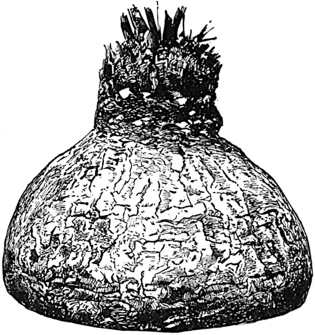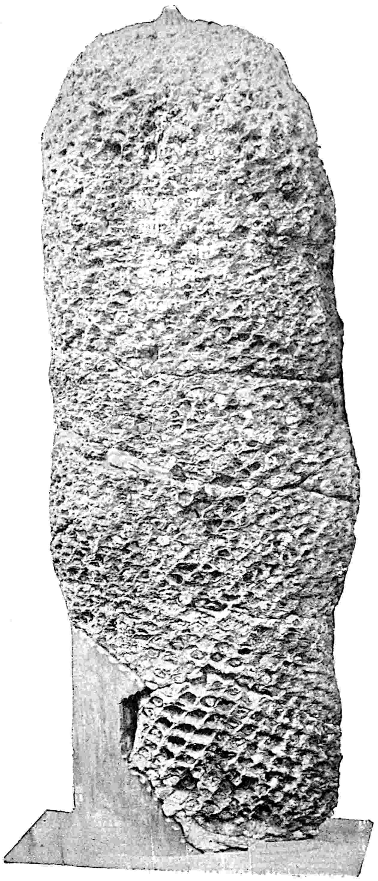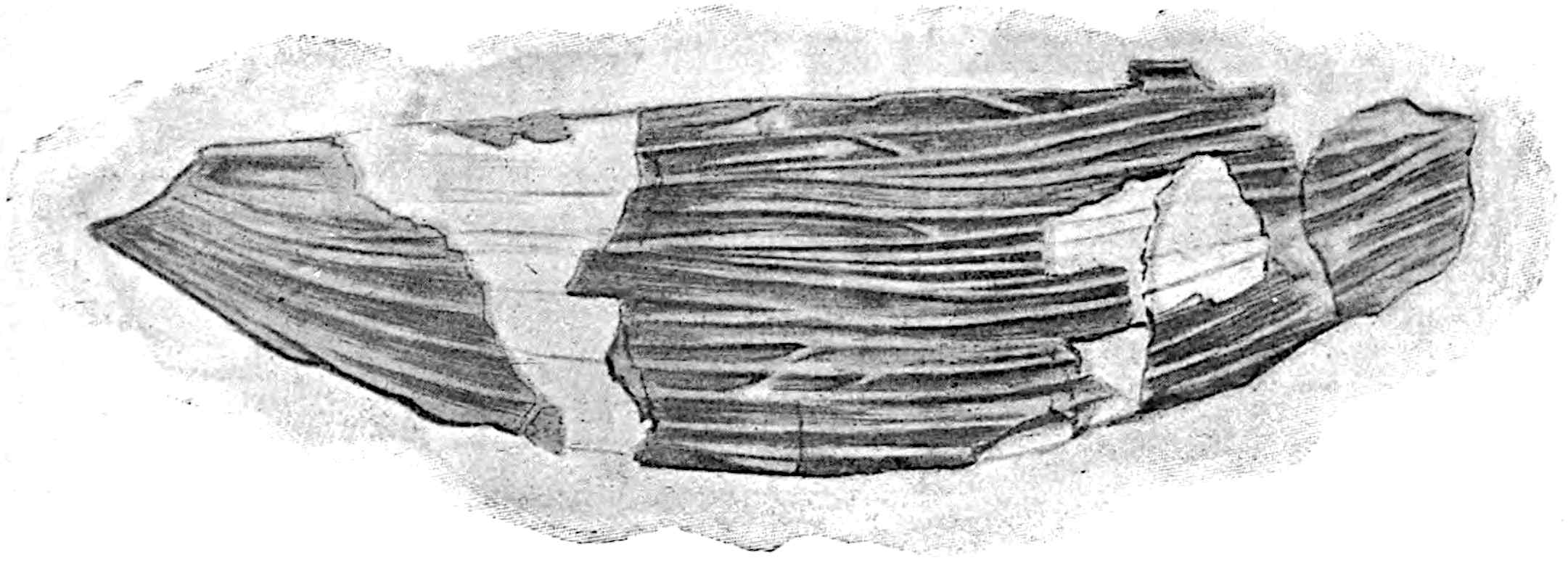 The employment of this generic name may serve a useful purpose if used for specimens, whether preserved as petrifactions or impressions, believed to be portions of Cycadean frond-axes, but which in the absence of pinnae cannot be assigned to one of the recognised genera of fronds. Saporta[1770] describes two species from Kimmeridgian beds in France, Cycadorachis abscissa and C. armata: the first may be the winged base of a Cycadean petiole, but it agrees equally well with the broad base of an Osmundaceous 591leaf and should not be referred to a genus implying affinity with a particular class. The other species, C. armata, is probably a piece of a spinous axis like that of the Wealden plant Sewardia latifolia (Sap.). A fragment figured by Fliche and Bleicher[1771] from the Jurassic of Nancy as C. tuberculata is another example of a fossil which cannot be referred with any certainty to the Cycads.