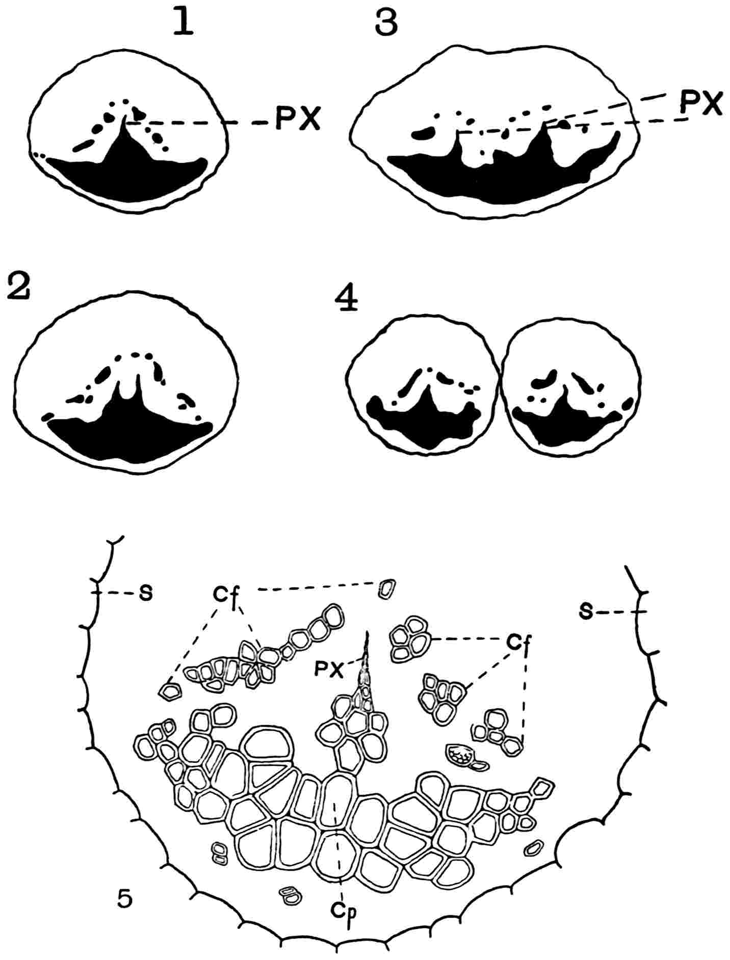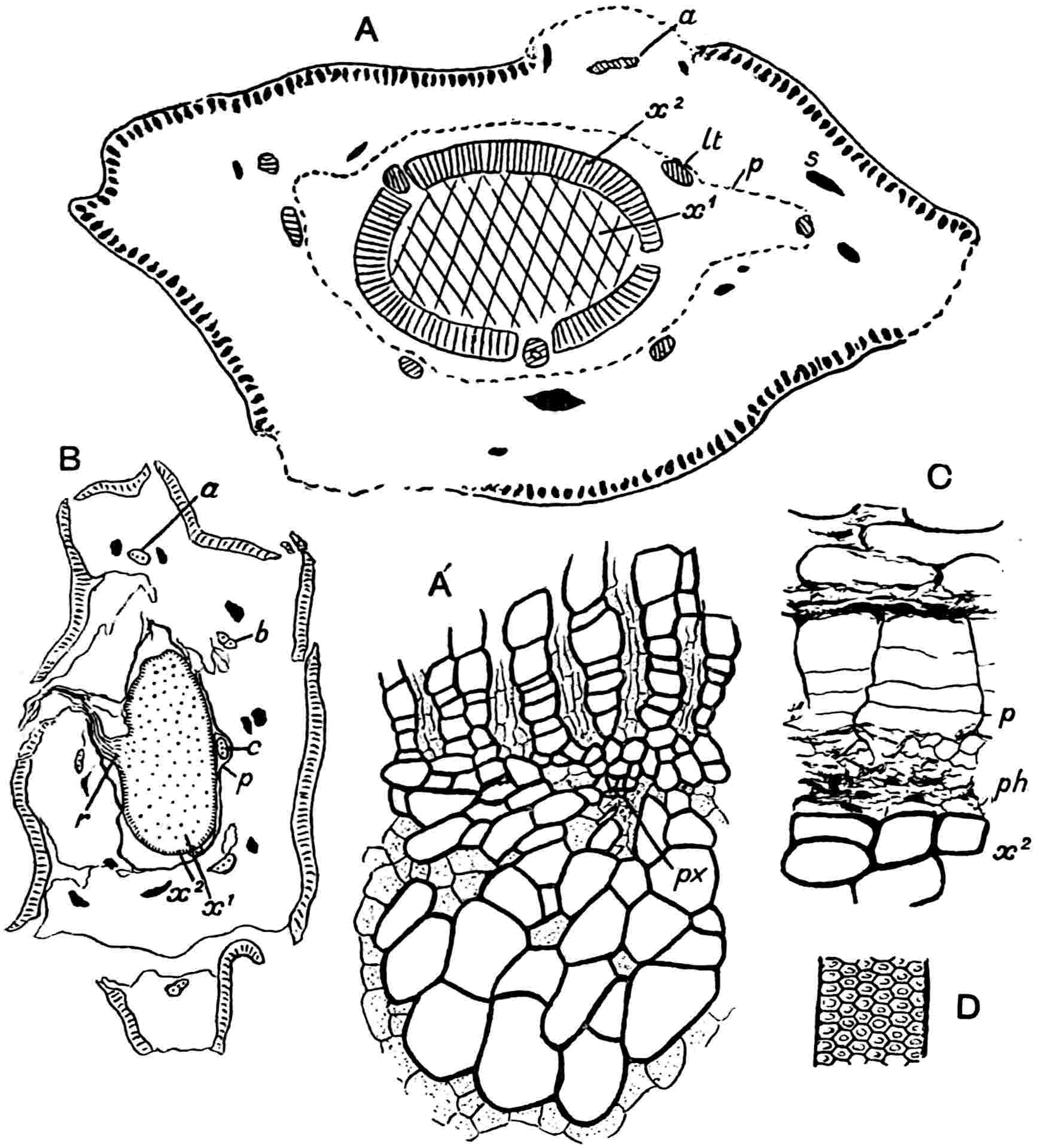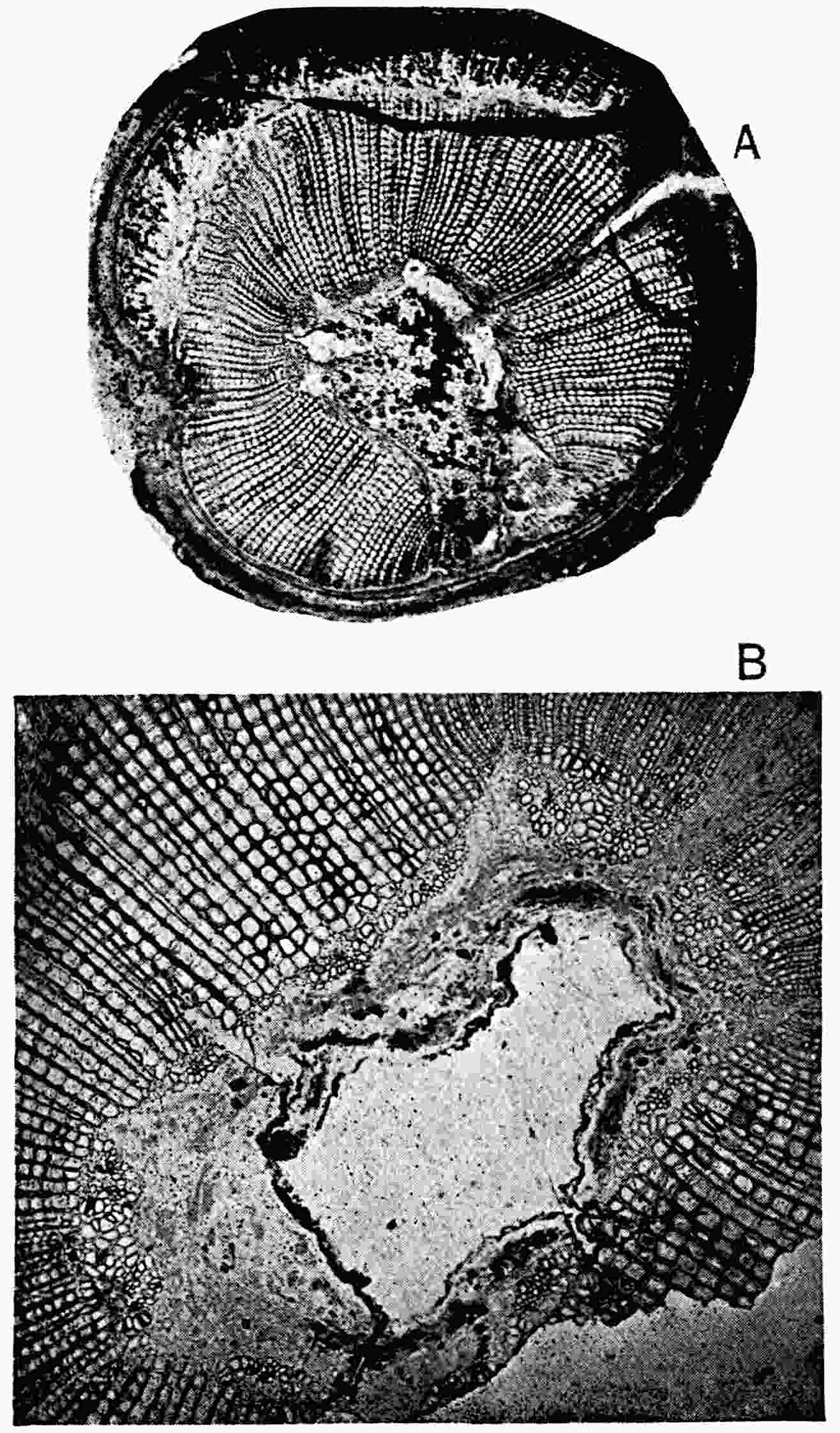 ‘The re-examination of Pitys primaeva and P. antiqua in the light of the structure exhibited by numerous specimens of a new species recently discovered in Haddingtonshire has shown that all three types are similar as regards the structure of the primary wood. In each case the primary cylinder is comparable with that in Archaeopitys Eastmanii [see p. 290], i.e., there are medullary as well as circummedullary xylem-strands. In certain specimens of the new species, Pitys Dayii, the bark and leaves are preserved and thus the details of leaf-trace emission from the stem have been determined. The leaves are short and stout and taper gradually to a point, quite distinct from the long, thin, spatulate Cordaitean foliage. The internal structure of the leaf renders it easily distinguishable from the Cordaites type while it tends to accentuate the possible relationship of Pitys with the Lyginodendreae.’