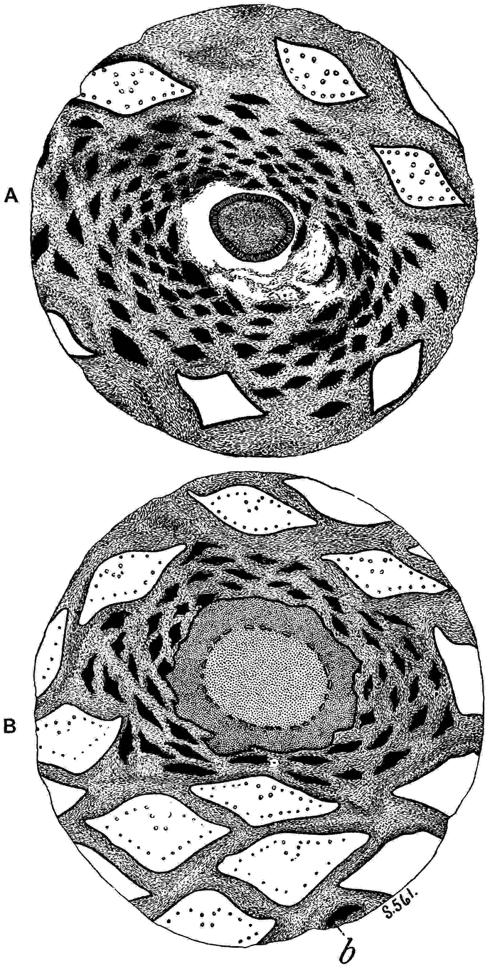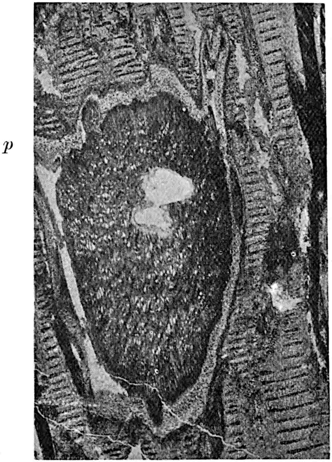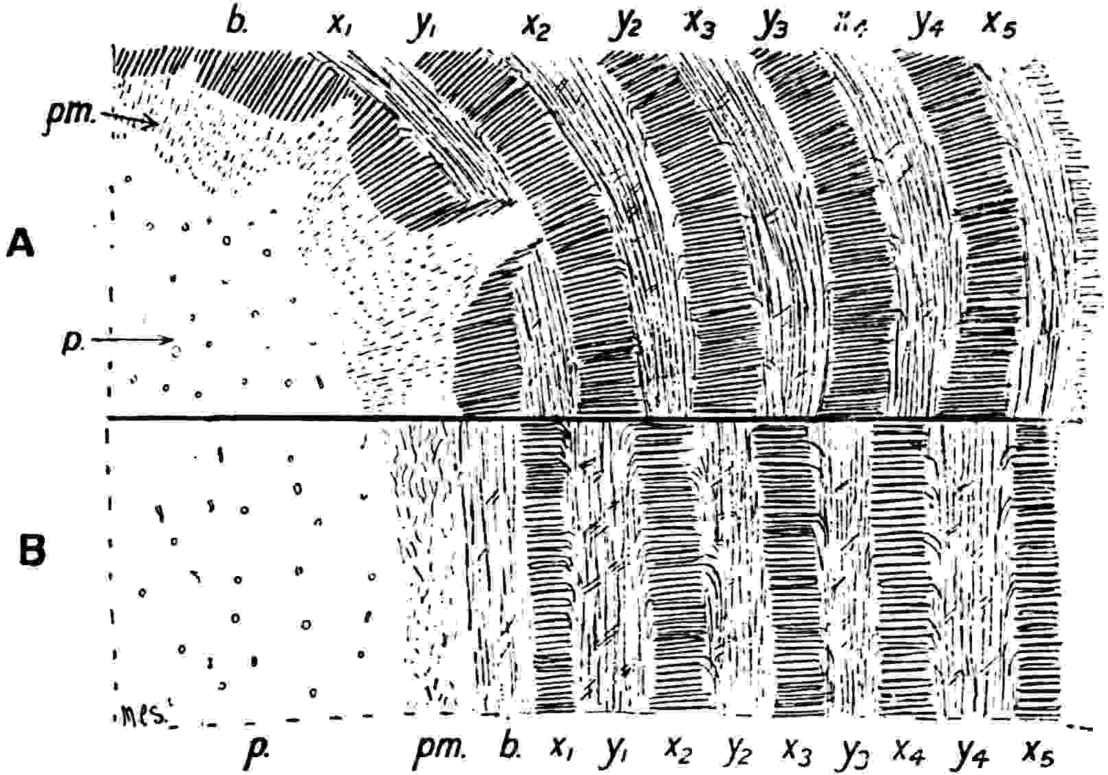 ‘The re-examination of Pitys primaeva and P. antiqua in the light of the structure exhibited by numerous specimens of a new species recently discovered in Haddingtonshire has shown that all three types are similar as regards the structure of the primary wood. In each case the primary cylinder is comparable with that in Archaeopitys Eastmanii [see p. 290], i.e., there are medullary as well as circummedullary xylem-strands. In certain specimens of the new species, Pitys Dayii, the bark and leaves are preserved and thus the details of leaf-trace emission from the stem have been determined. The leaves are short and stout and taper gradually to a point, quite distinct from the long, thin, spatulate Cordaitean foliage. The internal structure of the leaf renders it easily distinguishable from the Cordaites type while it tends to accentuate the possible relationship of Pitys with the Lyginodendreae.’
