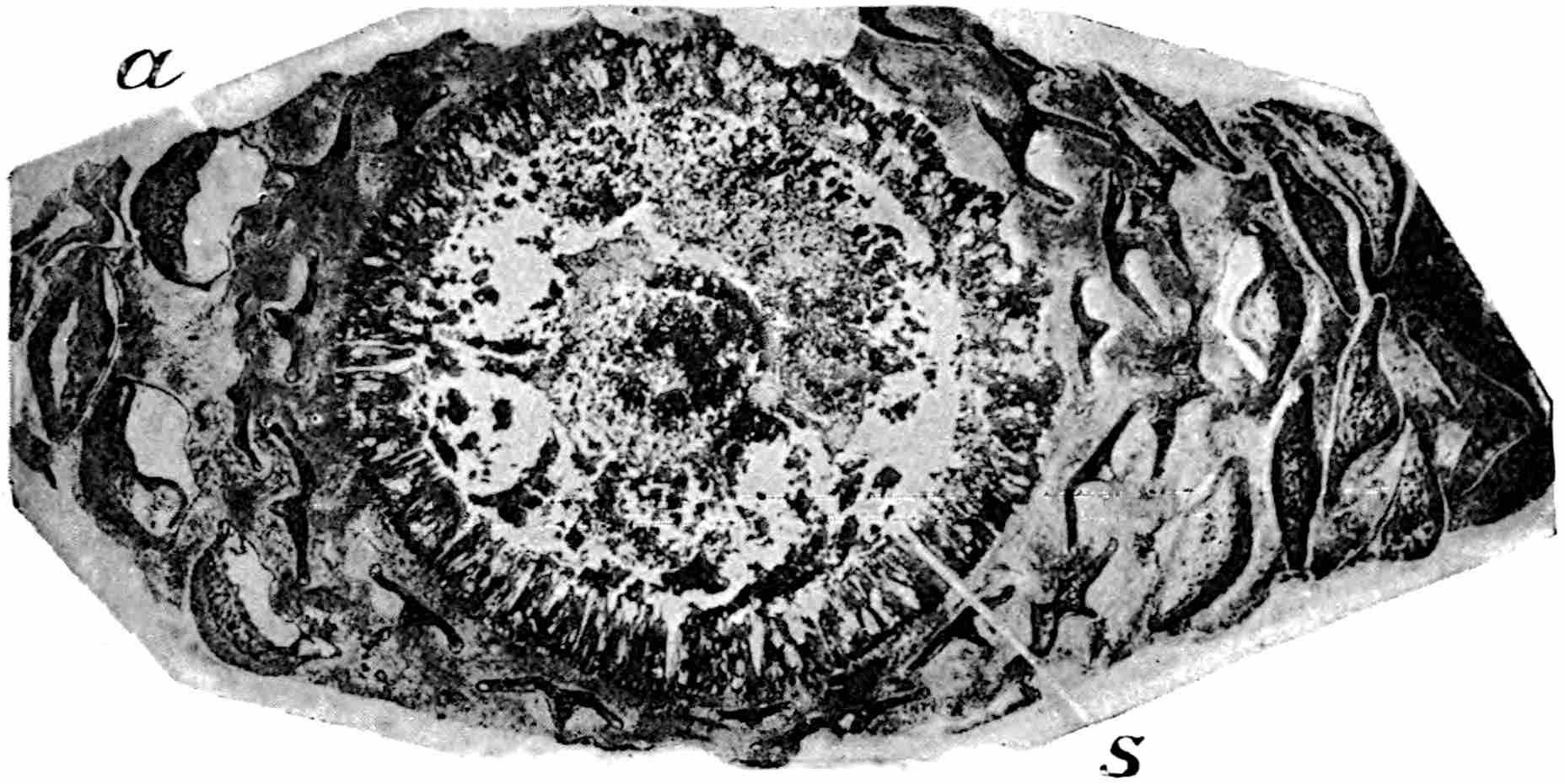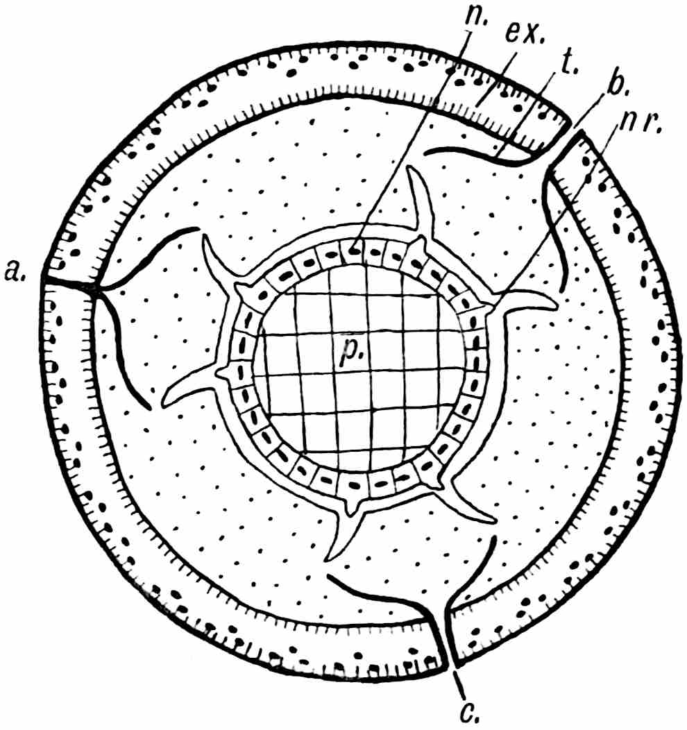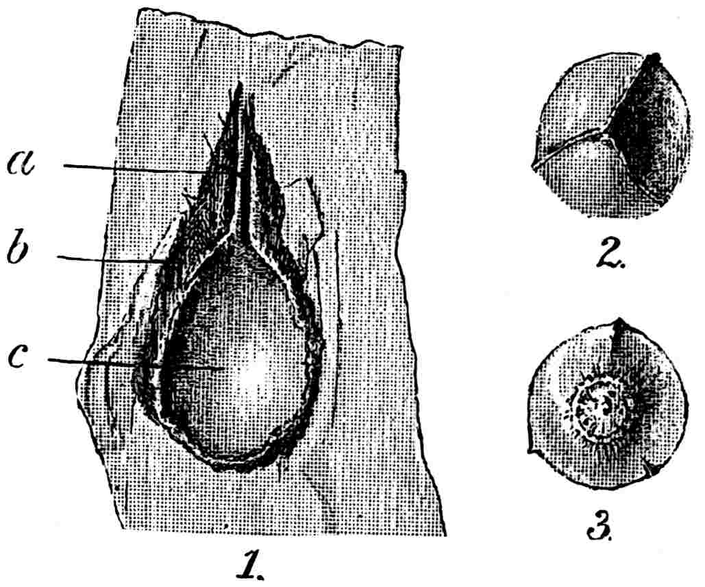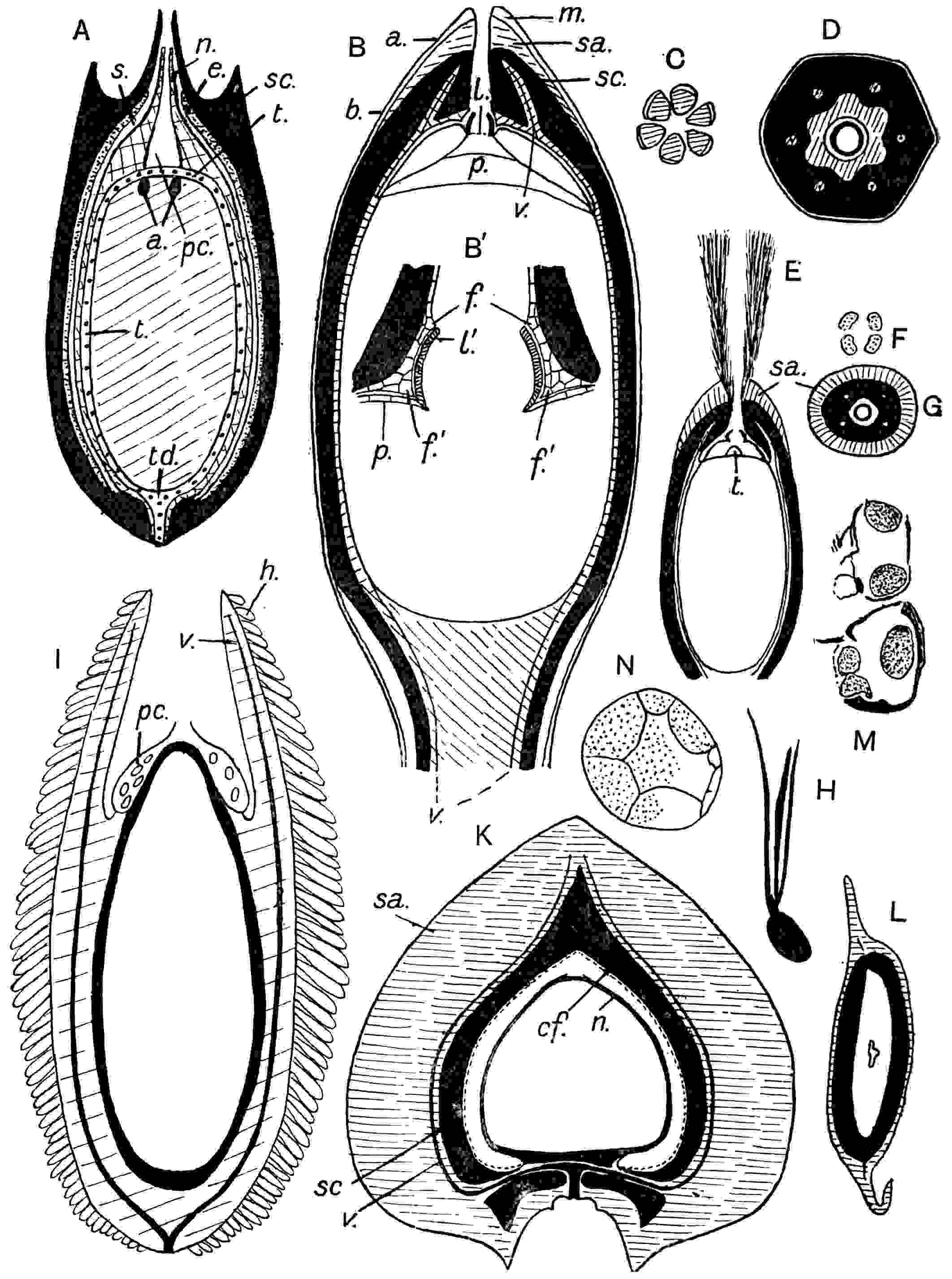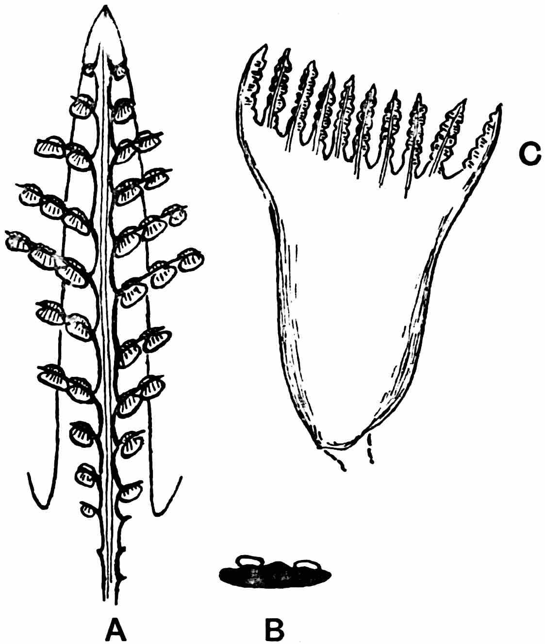 A Rhaetic Scanian species originally referred by Nathorst[1678] to Nilssonia but later removed by him to Dioonites[1679] and in 1909 reinstated in Nilssonia[1680] on the ground that the lamina covers the upper face of the rachis. The segments are fairly uniform in breadth and linear; they reach 10 cm. in length and are usually 5–7 mm. broad; the lamina is slightly tapered towards the apex (fig. 619, B). There are 3–10 parallel grooves on the upper 573face of the segments and between each pair is a single unbranched vein. In close association with portions of three fronds of this species Nathorst found several oval bodies, 1 cm. × 7 mm., which he at first regarded as ‘antherangia’ comparable with the sporocarps of the Hydropterideae, but an examination of the carbonised tissue demonstrated that the small rounded bodies contained in each of the ‘antherangia,’ originally believed to be pollen-sacs, are grains of resin internal to a cuticle of thick-walled cells and probably formed by secretory sacs in a fleshy tissue. Internal to the resin-bodies is a second cuticle which may be the remains of a nucellus, the outer cuticle and the resin belonging to the sarcotesta. Nathorst’s careful examination of these fossils shows that they are seeds (fig. 619, A) and were probably borne on plants of N. pterophylloides, though an accidental association is not improbable.