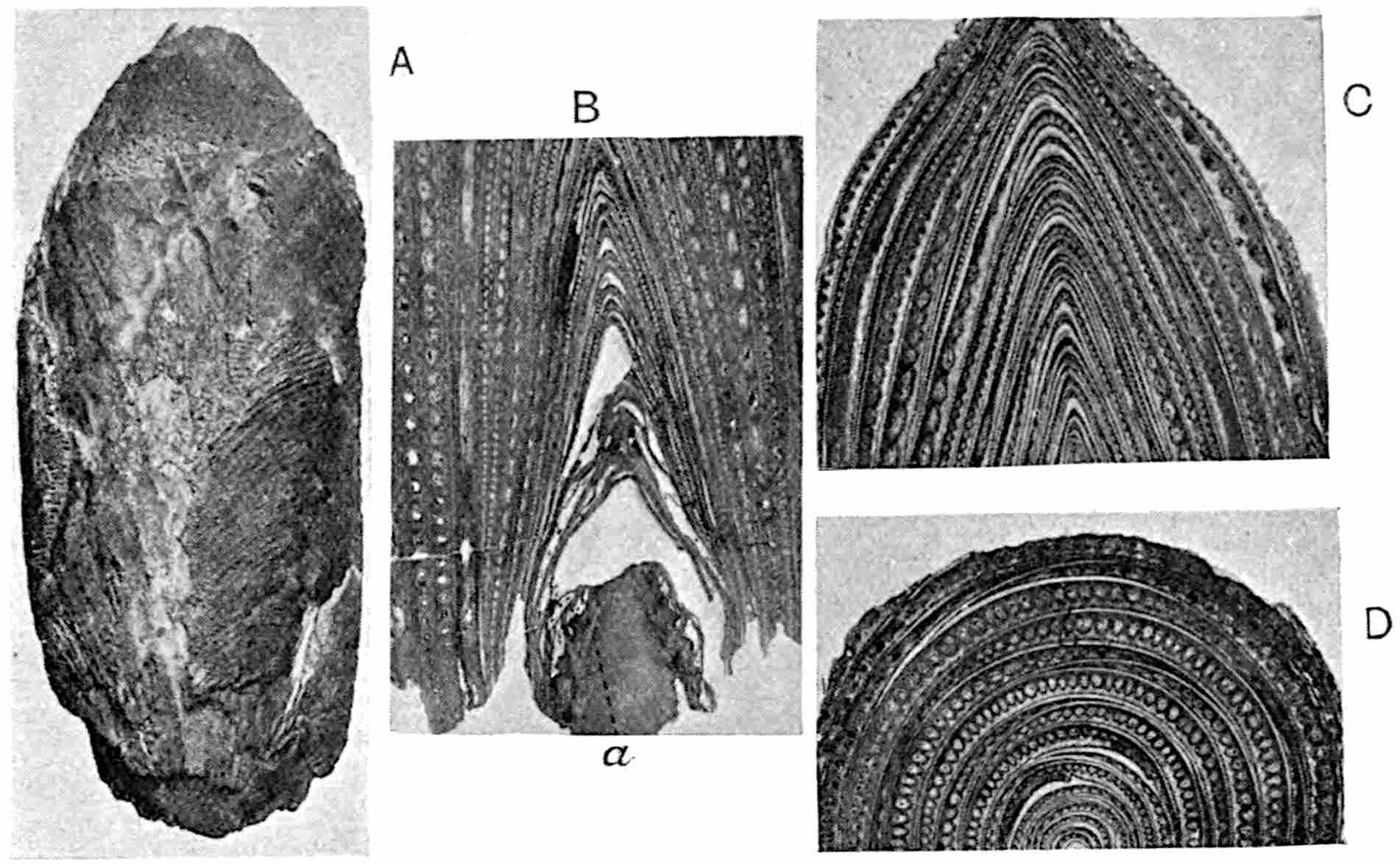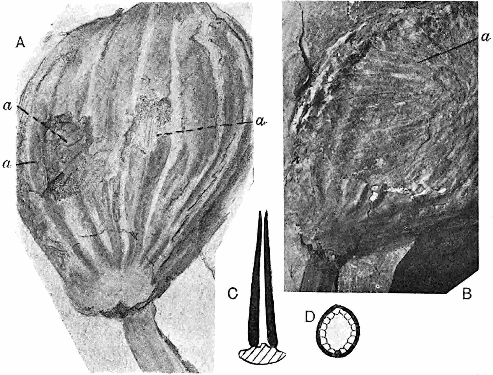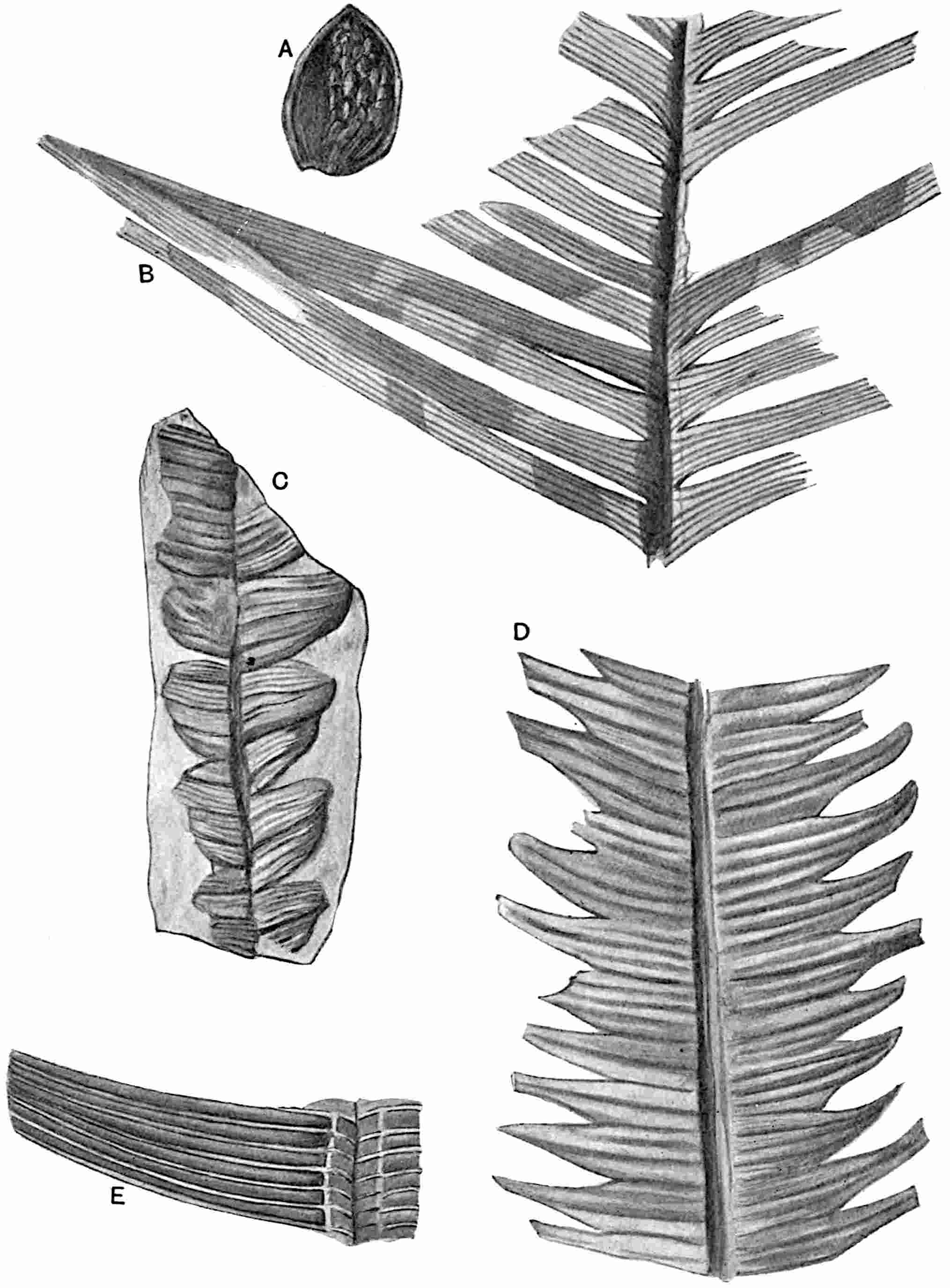 This genus[1659] was named after the Swedish naturalist Nilsson who had figured certain plants from the Lias of Höör referred by Fries to the Ferns: these were named by Brongniart Nilssonia brevis and N. elongata and classed with the Cycads. The type-specimens of the latter species are regarded by Nathorst as a form of N. brevis. The history of the genus is fully discussed in Nathorst’s able monograph[1660]. Nilssonia, founded on fronds which with one exception are known only as casts or impressions, may be thus defined: Fronds with circinate vernation, at least in the type-species Nilssonia brevis (fig. 619, C, D), similar in shape to the leaves of Scolopendrium vulgare and Polypodium irioides and to such unusual forms of Cycas fronds as those reproduced in figs. 384, 387, I[1661], in which the laminae of the pinnae are concrescent and form a continuous or deeply cut lamina. They may reach a length of 60 cm. and a breadth of 10 cm. and some specimens are known in which the leaf is less than 1 cm. in width. The lamina is occasionally entire, but in the great majority of cases it is more or less deeply cut into segments of unequal breadth varying considerably in size and shape even in the same species, usually deep and truncate and sometimes long and narrow (e.g. N. pterophylloides, fig. 619, B). An important distinguishing feature is the attachment of the lamina to the upper face of the rachis which it covers: the extension of the lamina over the surface of the frond axis and the rare occurrence of branching 568of the veins are characters in which Nilssonia differs from Taeniopteris. The veins are given off at right-angles or obliquely from a very narrow groove occupying the median line of the rachis; they are nearly always simple and in some of the more fleshy leaves, e.g. N. brevis, they are seldom visible. The surface of the lamina may be smooth or transversely corrugated. The rachis forms a prominent rib on the under surface of the frond (fig. 620, A) and may be continued beyond the lamina as a short petiole. Epidermal cells polygonal or rectangular, with straight walls in contrast to the sinuous walls of Taeniopteris; some of the cells bear strongly cuticularised papillae, possibly the bases of hairs (compare the hairs on the fronds of Acrostichum crinitum, a Fern with leaves similar in shape to some of the large entire fronds of N. orientalis though relatively broader and with anastomosing veins). Stomata usually confined to the lower epidermis and not very numerous; guard-cells of rounded contour and without any special thickening surrounded by 6–8 accessory cells with thickened walls (fig. 611, B) forming a chimney slightly raised over the stomatal pore[1662]. In Nilssonia the guard-cells do not exhibit that regularity of orientation which characterises the stomata of Ptilophyllum, Otozamites, and other Bennettitalean fronds. Little is known of the anatomy of the leaves: in a petrified leaf of N. orientalis[1663] from Upper Cretaceous rocks in Japan there is no palisade-tissue and small groups of sclerenchyma occur above and below the veins. The xylem appears to be centripetal, but the preservation is far from satisfactory. A few secretory canals were found near the edge of the leaf. We have no certain knowledge of the reproductive organs. The small circular projections figured by Schenk[1664] on some leaves of Nilssonia polymorpha as sporangia have no claim to be so regarded. In the description of N. brevis reference is made to some seeds discovered by Nathorst which may belong to that species. Nathorst suggests the possibility that the Rhaetic fossil Stenorrachis scanicus Nath. may be the seed-bearing shoot of a Nilssonia, either N. brevis or N. polymorpha, and if this surmise is correct it almost necessarily involves the genus Beania[1665] which has been tentatively referred to the 569Ginkgoales though without any convincing evidence to support such connexion. Nothing is known of the stems: the occasional occurrence of leaves converging towards a common support points to a Cycadean habit. It is possible, as Nathorst suggests, that the Rhaetic species Bucklandia Saportana[1666] may be the stem of a Nilssonia.