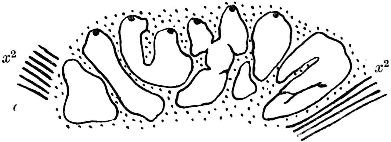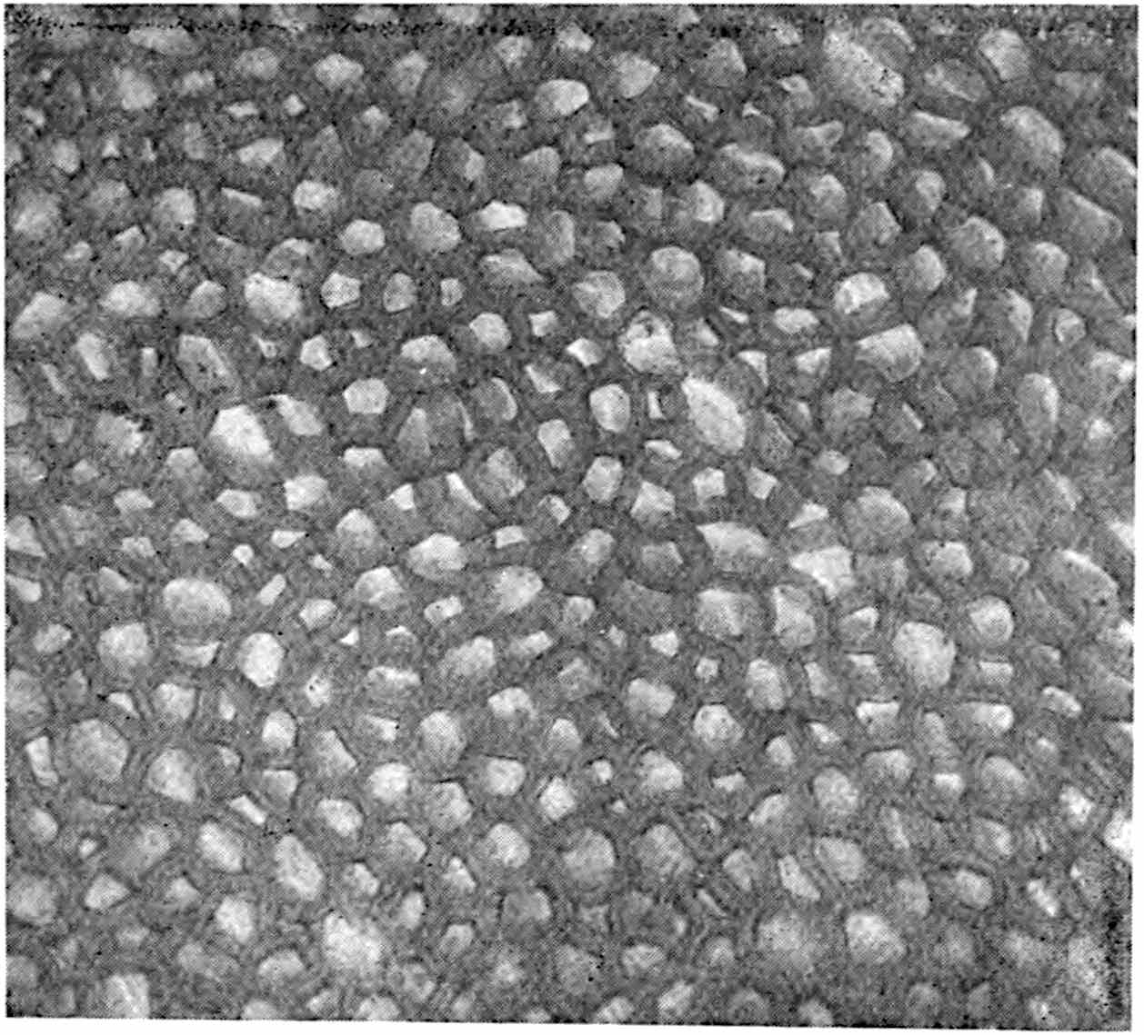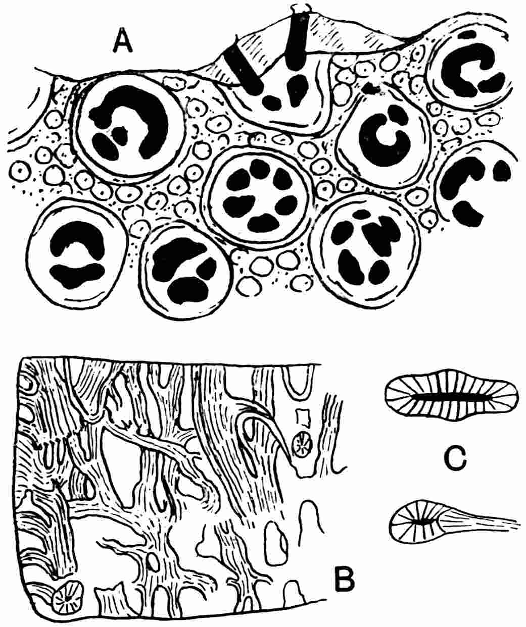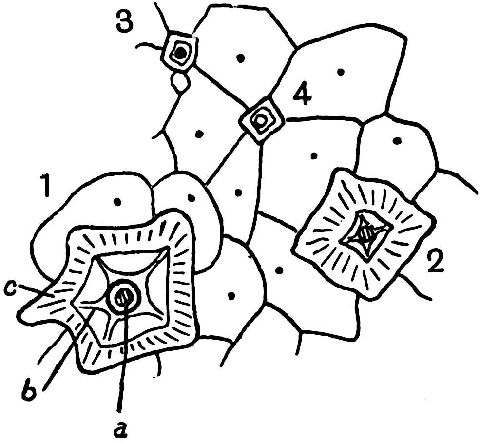 The pinna shown in fig. 624 from the Jurassic beds in Yorkshire[1737] is interesting as one of the few examples of the preservation of the cuticular membrane. The straight or curved walls of the epidermal cells agree with those of recent Cycads except Stangeria, and each cell bears a large central papilla that gives to the lamina the finely punctate appearance which has been regarded as evidence of sporangia. The gaps in the cuticle probably mark the position of sunken stomata.