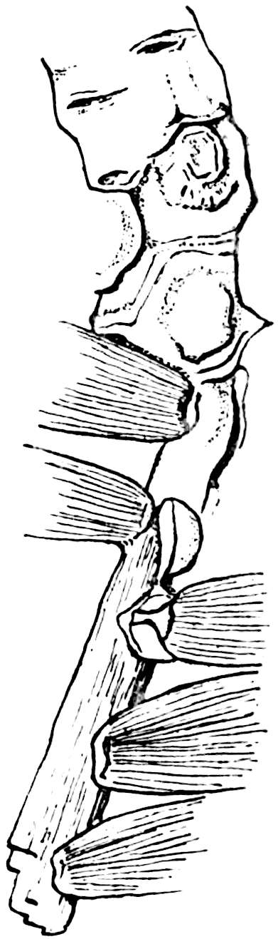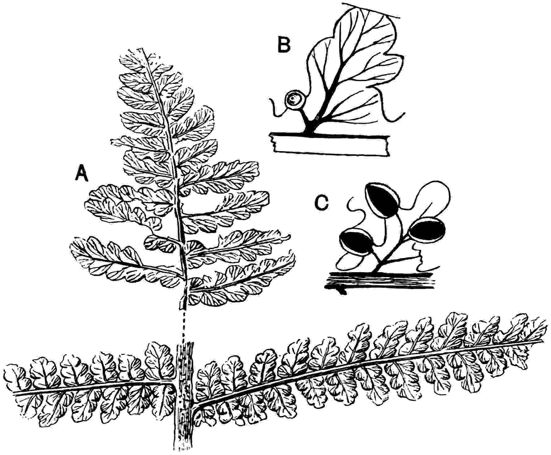 Fronds pinnate; pinnae linear, attached by the whole base, which may be enlarged; the apex is truncate, rounded, or occasionally pointed; the veins are simple or dichotomously branched and parallel to the edge of the lamina. In some fronds (sub-genus Anomozamites) the segments are unequal (fig. 615), short, broad 550and truncate, and the lamina may be entire or divided into a few very unequal segments. The surface of the rachis is never completely covered by the lamina on the upper face of the frond and is often characterised by transverse wrinklings, possibly due to the presence of ramental scales.