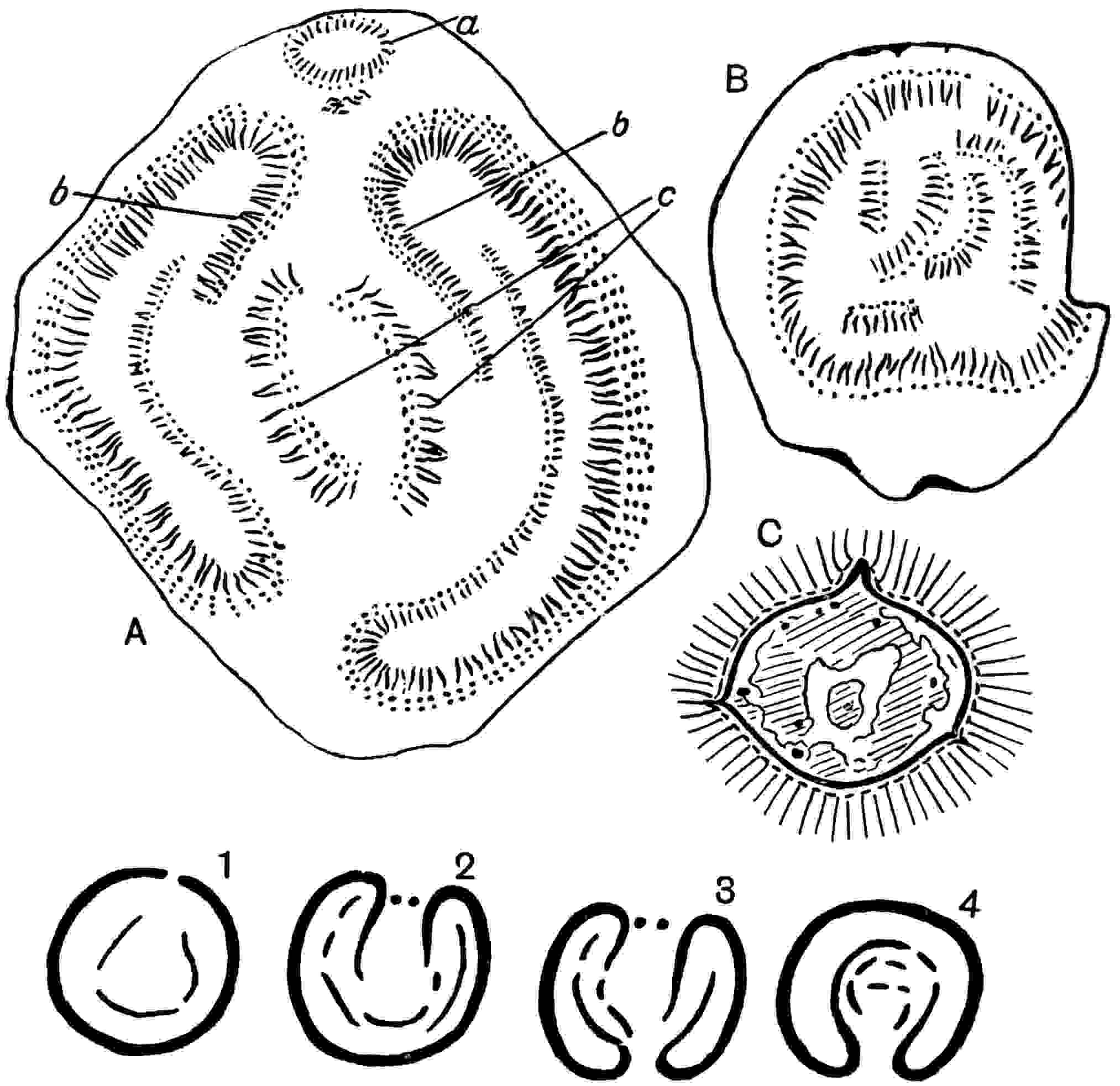This species[1672] (fig. 619, C, D), one of those from Höör on which the genus was founded, has been very fully investigated by Nathorst[1673] whose researches have cleared up many obscure features. The young fronds are circinate like those of Ferns and Cycas. The linear fronds agree generally in habit with those of N. polymorpha and N. compta, but the lamina is thicker and is characterised by regular transverse corrugations; the veins are very rarely visible except in young leaves which have not reached their full thickness. The fronds may be 50 cm. long and vary in breadth from 1·5 to 12 cm.; the petiole is very short or the frond may be 572sessile. Between the regular grooves on the upper surface the lamina is more or less convex; seen from below the grooves are represented by ridges and between each pair of ridges there are parallel folds, sometimes three (fig. 620, B) or as many as six; and where the segments are narrow, that is the strips of lamina between two grooves (or ridges), there may be only a single fold which gives the appearance of linear segments with a single midrib as in Cycadites, a misleading resemblance of special interest in reference to the Nilssonia fronds described by Oldham and Morris[1674] and by Feistmantel[1675] as Cycadites rajmahalensis. Owing to the fleshy nature of the leaf the difference between the upper and lower side is particularly well marked in this species. The lamina may be more or less entire, but is usually divided by deep sinuses extending to the rachis into truncate or distally tapered segments varying in breadth (fig. 619, C, D), the narrow segments being characterised by a more pointed apex than in N. polymorpha. The structure of the stomata and epidermal cells is of the type described in the definition of the genus. Strongly cuticularised papillae, incorrectly described by Schenk[1676] in N. polymorpha as stomata, occur on some of the epidermal cells: these may be the bases of hairs. In some preparations Nathorst found patches of a resinous substance, an interesting discovery in view of the occurrence of secretory canals in the petrified leaf of Nilssonia orientalis described by Dr Stopes[1677].