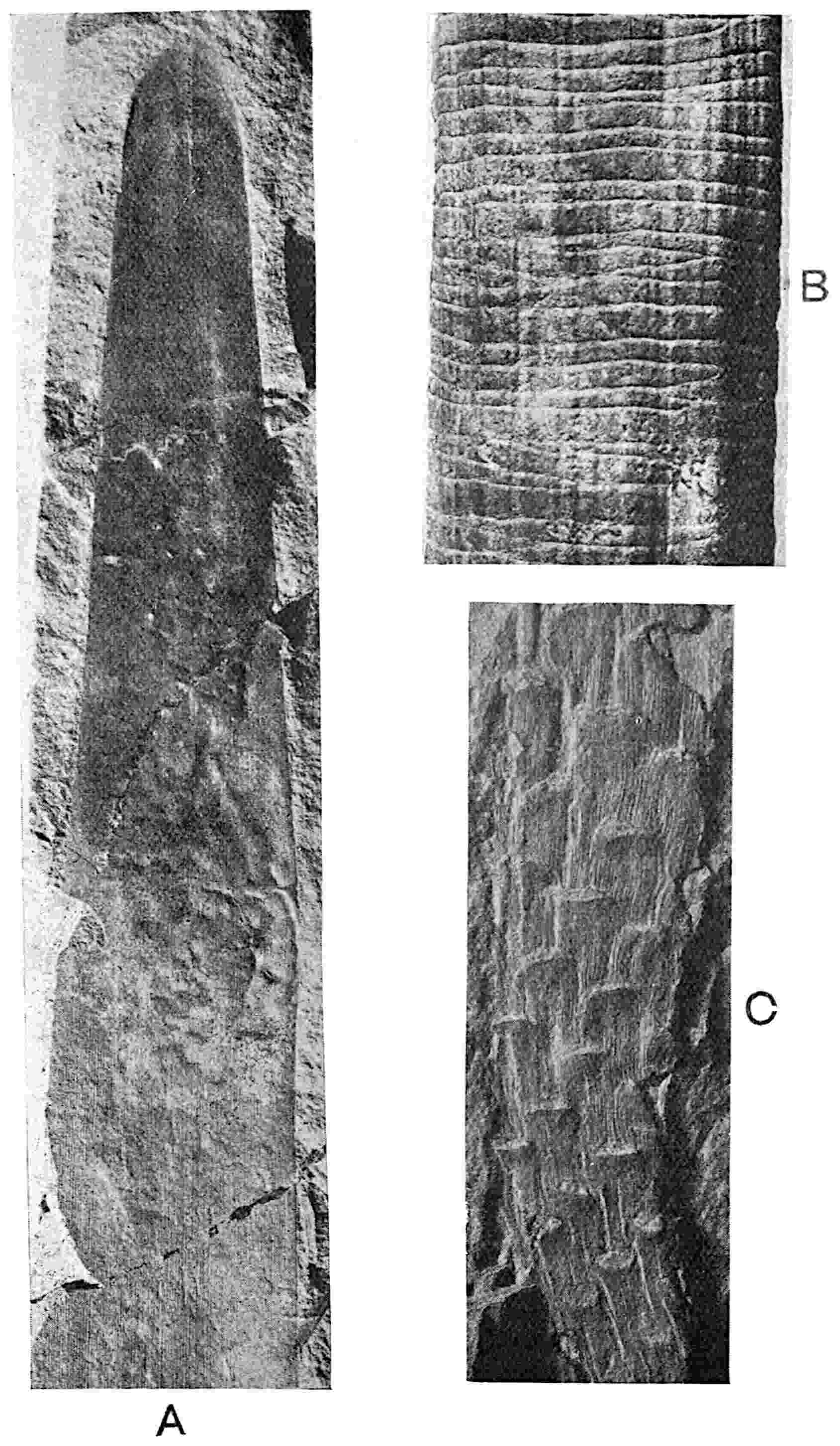 A Rhaetic species founded[1614] on specimens from Persia and described also by Zeiller[1615] from Tonkin represented by fronds 5551 met. long and at least 15 cm. broad. The segments, 3–7 cm. long and 8–18 mm. broad, are often set at right-angles to the rachis; the edges are parallel but the lower edge bends upwards at the apex. The veins are simple or forked and approximately 0·3 mm. apart.