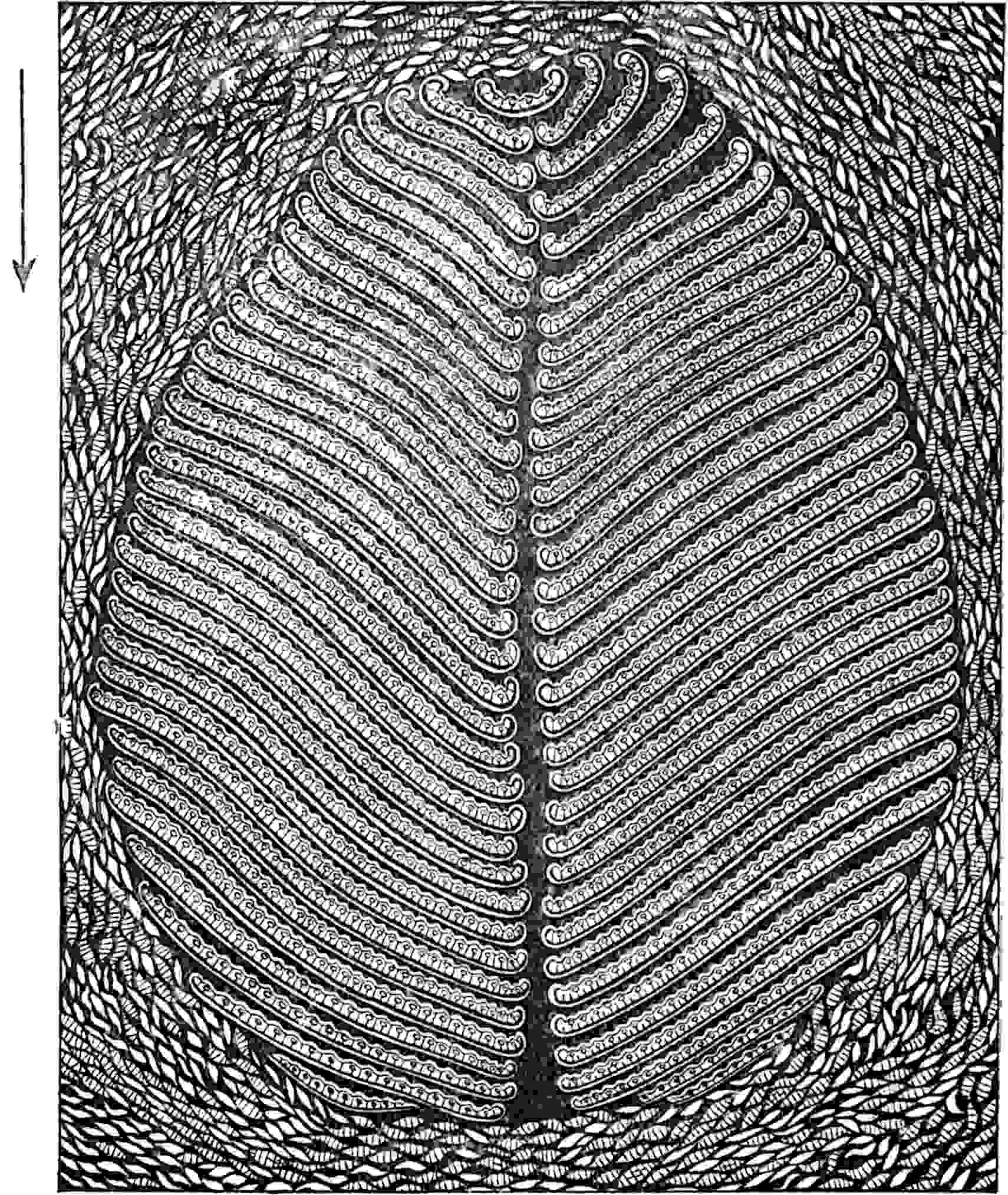 Founded on a specimen in the Scarborough Museum from the Middle Jurassic of Yorkshire[1551] which is indistinguishable from Leckenby’s type-specimen of Otopteris mediana[1552] in the Sedgwick Museum, Cambridge. Long and narrow fronds exceeding 20 cm. in length, characterised by the broadly oval, deltoid or sub-orbicular pinnae, separate or partially imbricate and attached by a broad auriculate base; apex bluntly rounded; veins numerous and spreading from the base of the lamina. The pinnae, which may be 3·5 cm. long and nearly 2 cm. broad, are narrower and longer in the distal part of the frond (fig. 606).