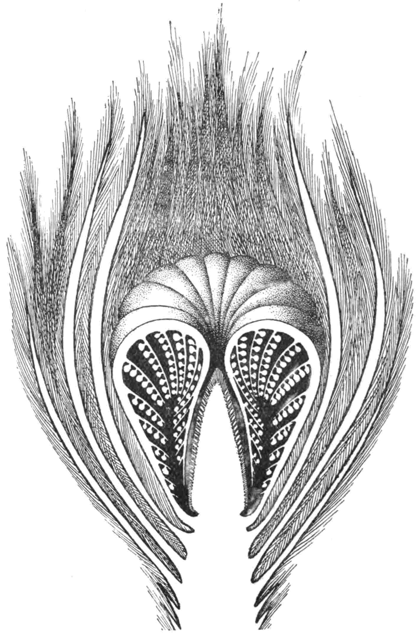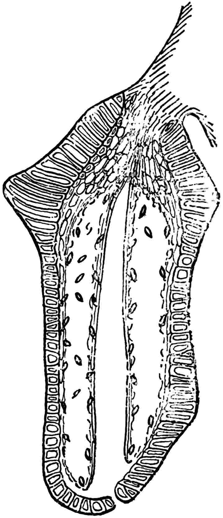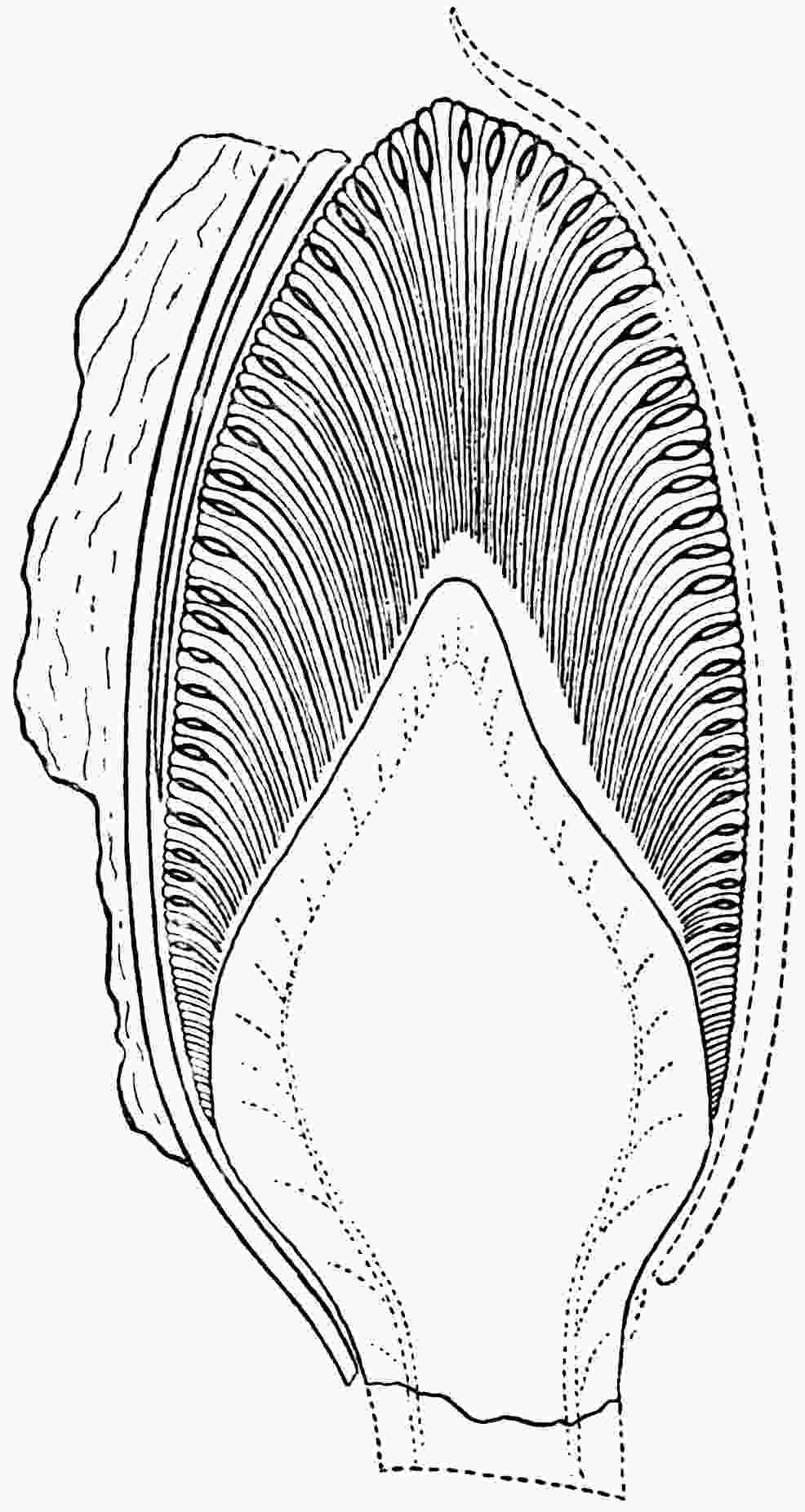 In a recently published and interesting paper on ‘Some Xerophytic Leaf-structures in Mesozoic Plants,’ Dr Halle[1637] makes some important additions to our knowledge of Pseudocycas. He agrees with Miss Holden’s views with regard to the use of the generic names Pseudocycas and Cycadites, but dissents from her interpretation of the median groove as the result of shrinkage of a midrib. Part of the evidence presented by Halle is based on the structure of the leaf-cuticle as shown in microtome sections[1638]. He found that a distinct median groove is always present on the pinnae of Pseudocycas insignis and other species. If the groove were due to collapse of the tissue of a true median rib the presence of stomata—which in P. insignis are confined to the middle line of the lamina—below the vein would be an unusual feature. He found no indication of a median vein or of any vascular tissue. All that is revealed by an examination of the cuticle is that the lamina has a well-defined groove bounded by prominent ridges, and in Pseudocycas Roemeri the groove is deeper and is formed by the bending-back of the lamina. The stomata are practically confined to the groove and in P. insignis and P. Steenstrupi an additional protection against excessive transpiration was afforded by elongated papillae.