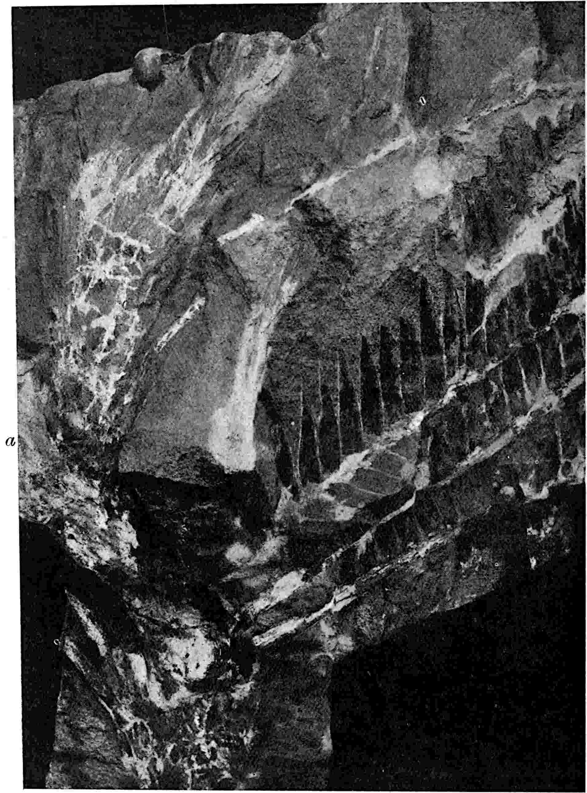 The type-specimen, from the Jurassic beds on the Yorkshire coast and now in the York Museum, was described by Phillips[1629] as Aspleniopteris Nilssoni and placed in Pterophyllum by Lindley and Hutton and many other authors[1630]. The fronds are linear; the lamina may be almost entire or divided into unequal deep truncate segments; the veins are simple or dichotomously branched (fig. 615). The leaves are very similar to those of Nilssonia; they were probably borne on stems similar to those described by Nathorst as Wielandiella. Reference is made to the structure of the epidermal cells in the account of the genus.