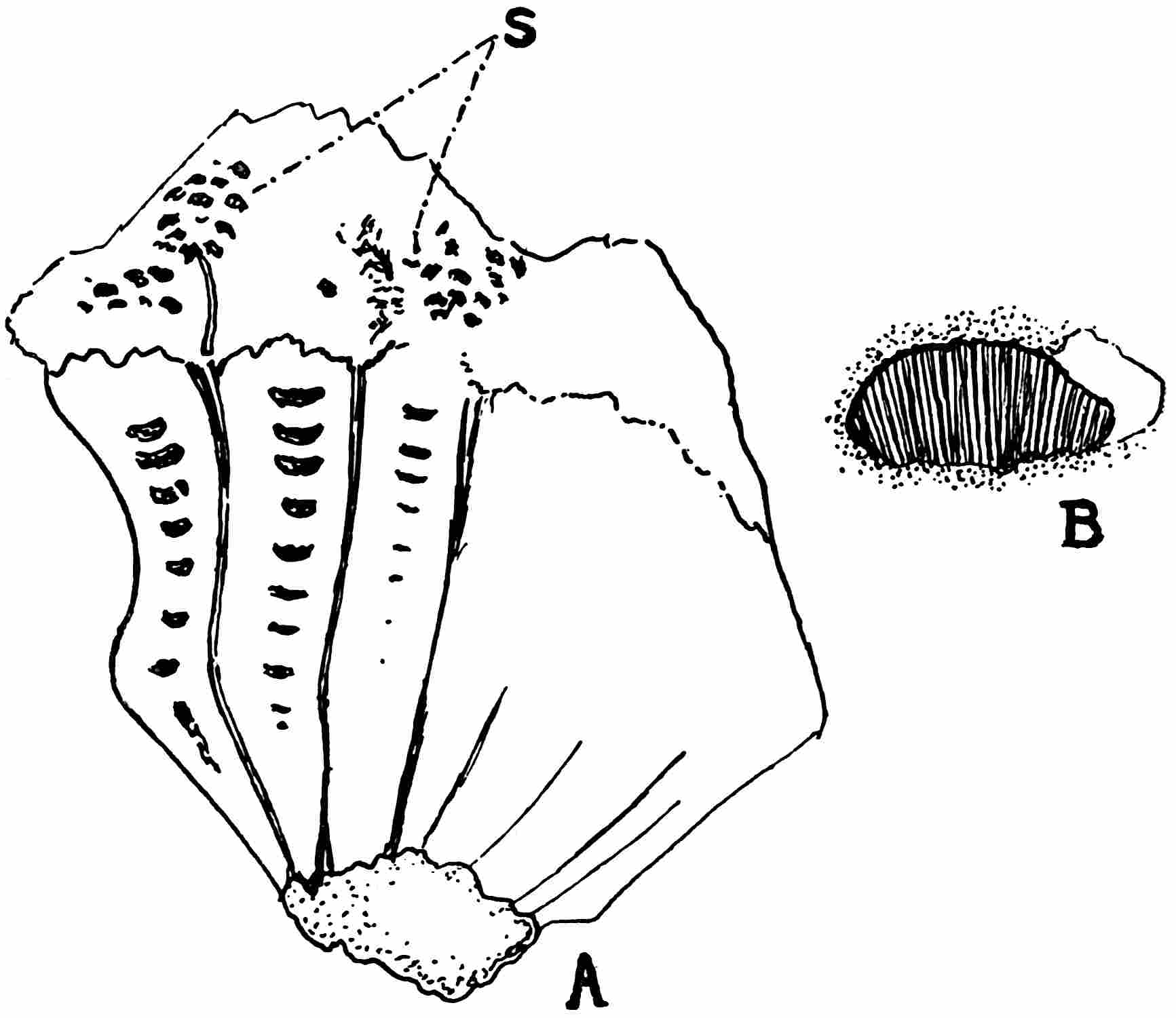 The generic name Cycadites was first used by Sternberg[1633] though it has since been shown that the specimens for which he proposed it belong to other genera. As employed by Brongniart[1634] and other authors Cycadites stands for fossil fronds agreeing in habit with the pinnate leaves of recent species of Cycas (fig. 387, A); the presence of a single median in the linear pinnae is generally regarded as an essential feature. Cycadites may be defined as follows: Fronds pinnate; pinnae alternate or opposite, linear entire, with a midrib and no lateral veins, attached to the rachis by the entire base, the lower margin of which may be slightly decurrent or narrowed near the point of attachment. Epidermal cells with straight walls and stomata agreeing in structure with 559those of the recent genus. As thus defined, including the characters of the epidermal cells, the genus has no representatives; but the generic name should also be applied, as Miss Holden[1635] has recently suggested, to fronds of the Cycas form which afford no information with regard to the structure of the epidermis. The resemblance of Cycadites fronds to those of Cycas, coupled with the fact that impressions superficially resembling megasporophylls of the recent genus are recorded from Mesozoic strata, was considered sufficient justification for the employment of a name implying close affinity to or even generic identity with Cycas. A fuller knowledge of the epidermal characters of some of the fronds hitherto included in Cycadites has necessitated the substitution of a new genus for Cycadites. An examination by Nathorst[1636] of Heer’s Lower Cretaceous Greenland species Cycadites Steenstrupi and of other fronds showed that the epidermal cell-walls are sinuous and the stomata arranged differently from those of Cycas. For these and other reasons Nathorst proposed a new name Pseudocycas. He also pointed out that the pinnae in the fossil fronds have as a rule a double ‘midrib.’ Nathorst’s discovery raised the question whether other fronds described as Cycadites should be transferred to Pseudocycas. Miss Holden’s investigation of other supposed Mesozoic representatives of Cycas leads to the conclusion that ‘it is not impossible that all Mesozoic specimens of Cycadites will turn out to be Pseudocycas.’ This observer shows that Cycadites Saportae Sew. and C. Roemeri Schk. agree in the sinuous walls of the epidermal cells with Pseudocycas; and so far no species of Cycadites, in which it was possible to examine the cuticular membrane, has been found that does not conform to Nathorst’s definition of Pseudocycas at least as regards the structure of the epidermal cells. Nathorst defined Pseudocycas in the following sense: Fronds similar to those of Cycadites and Cycas but with pinnae characterised by a double ‘midrib,’ the stomata being confined or almost confined to the groove between the two ‘midribs.’ Nathorst also notes that in Pseudocycas the bases of the pinnae are not contracted as is often the case in Cycadites and Cycas, but this is a feature of secondary importance. Miss Holden has, however, expressed the opinion 560that the double ‘midrib’ is an untrustworthy character and that the stomata are not always arranged as in the fronds examined by Nathorst. Nathorst states that in Pseudocycas Steenstrupi and P. insignis the midrib though usually double may be single: the same variation occurs in P. Saportae. Miss Holden found that an impression made from a pinna of Cycas siamensis showed a double line on the upper face and a single rib on the lower; that is Pseudocycas and Cycas characters occur on a single pinna. On drying, the ridge on the lower face of the lamina collapses and a groove is formed bounded by two ridges.