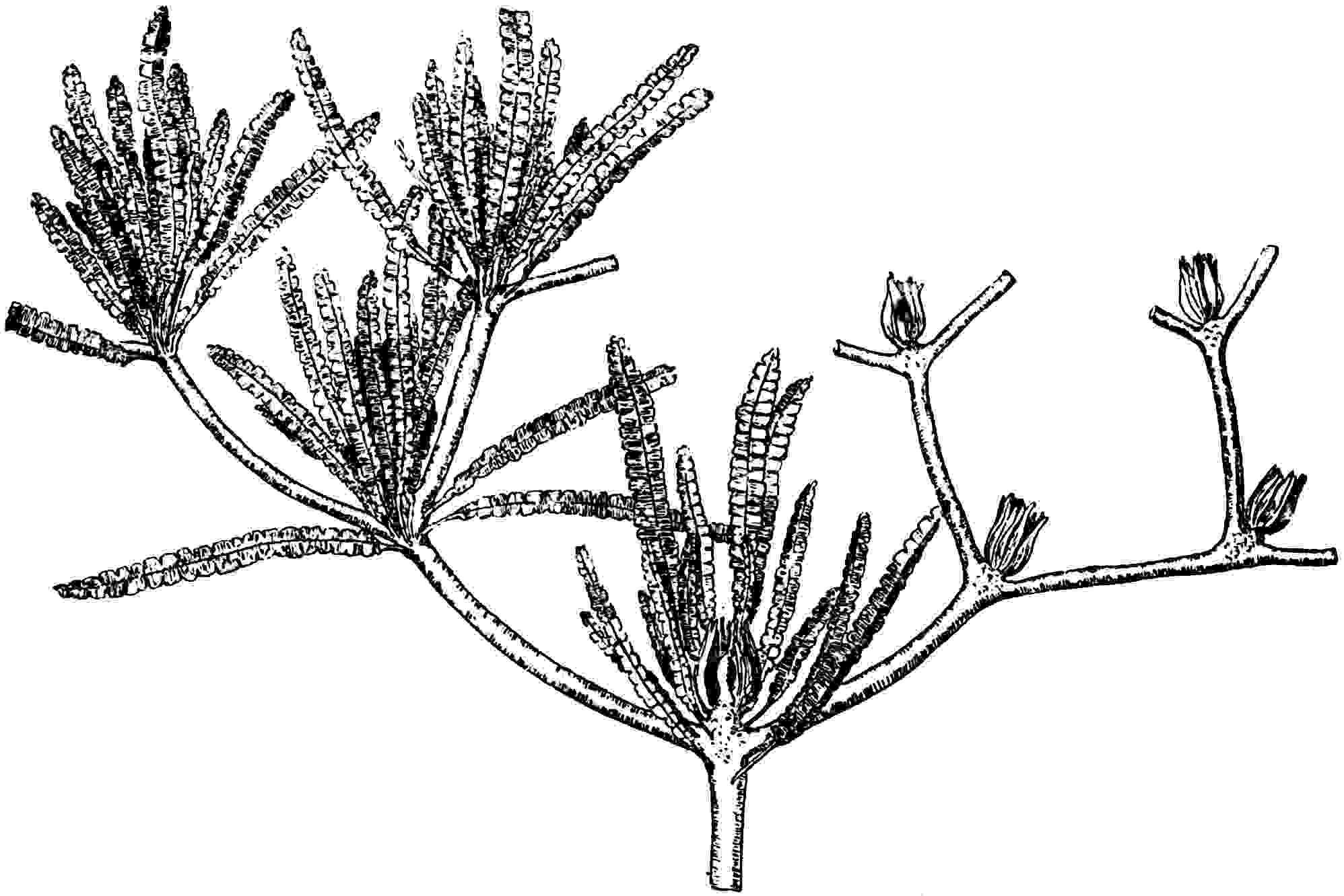 This Rhaetic species from Tonkin[1616] and Persia[1617] is interesting as affording an example of a frond with exceptionally narrow and contiguous pinnae. The frond is narrow and lanceolate, 15–20 cm. long with pinnae normal to the rachis, ·5–1 mm. broad and 7–25 mm. long attached by the whole base which is sometimes slightly enlarged. The veins are simple or forked, ·15–·25 mm. apart: the apices of the segments are rounded or truncate and the form of the whole is similar to that of Pterophyllum aequale but narrower.