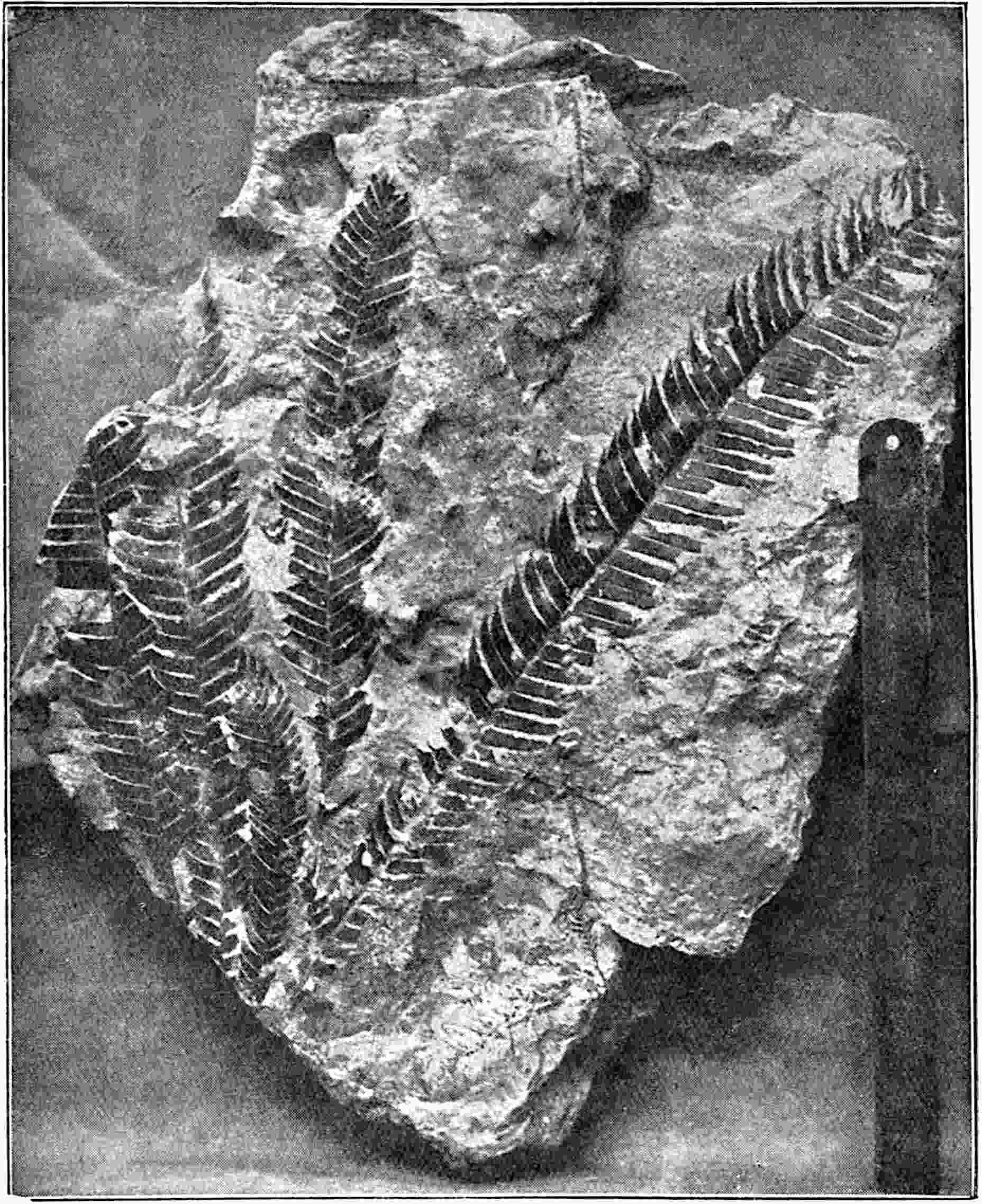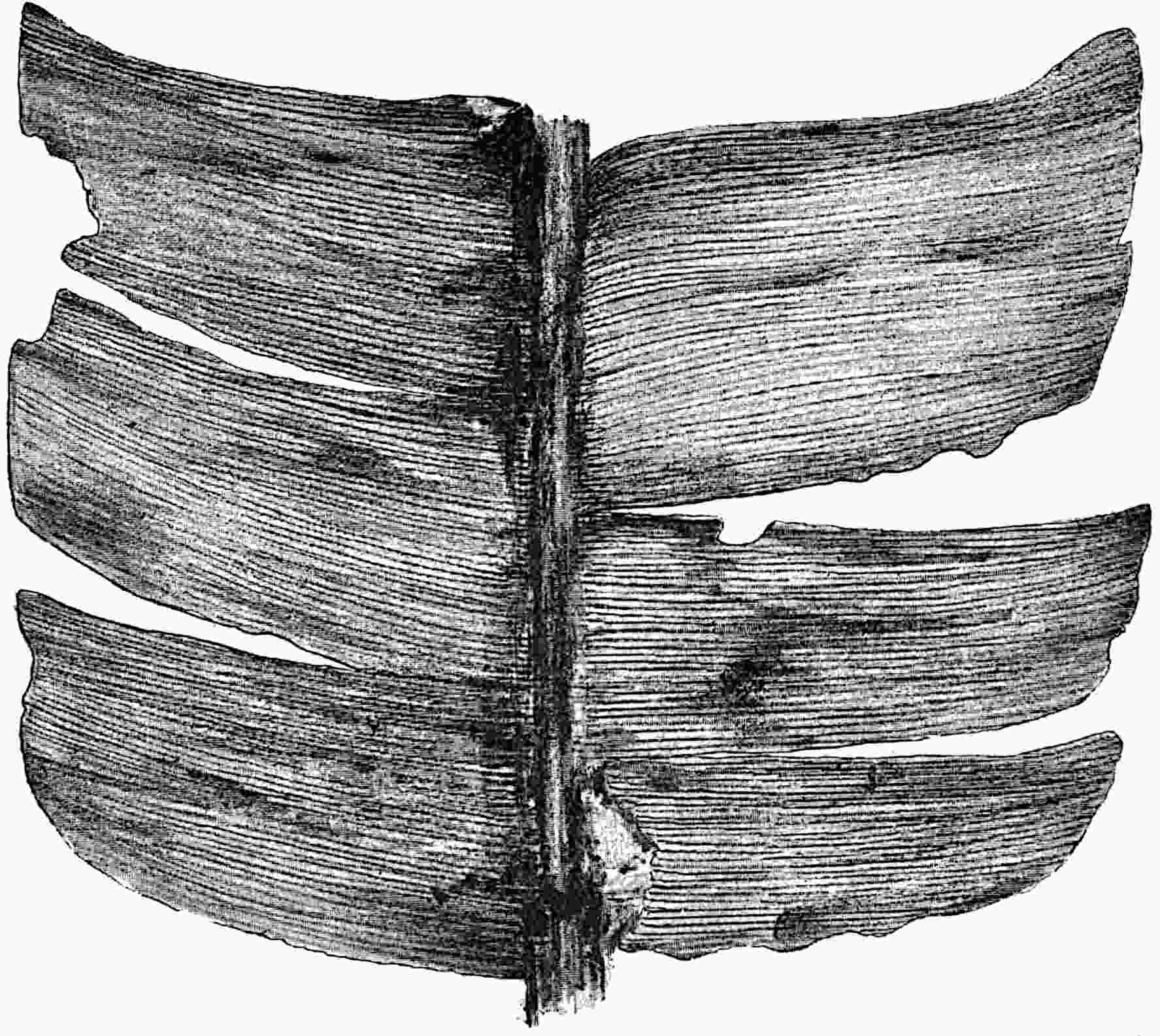 This species[1595] was founded on a large frond from the Commentry coalfield with a stout rachis bearing linear pinnae, attached along a narrow groove on its outer edge, reaching a length of 12 cm. and a breadth of 1 cm.; adjacent pinnae are united at the base. The apices are pointed and there are 10–12 unbranched veins in the lamina. Fig. 612 shows a small piece of the large specimen in the Natural History Museum, Paris.