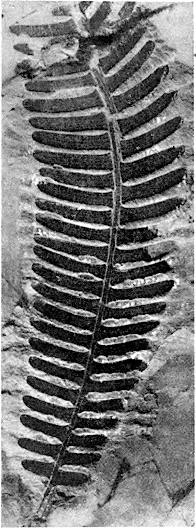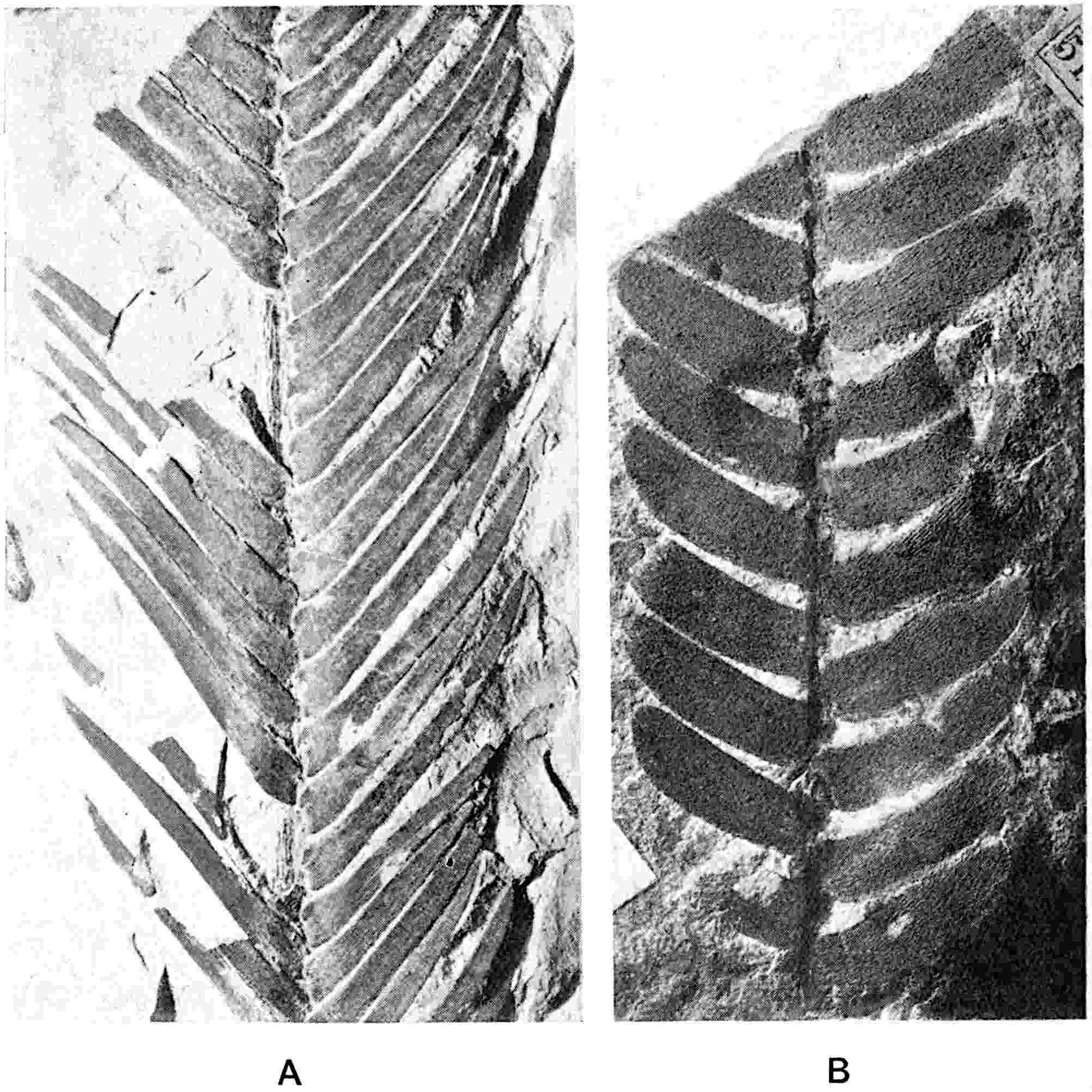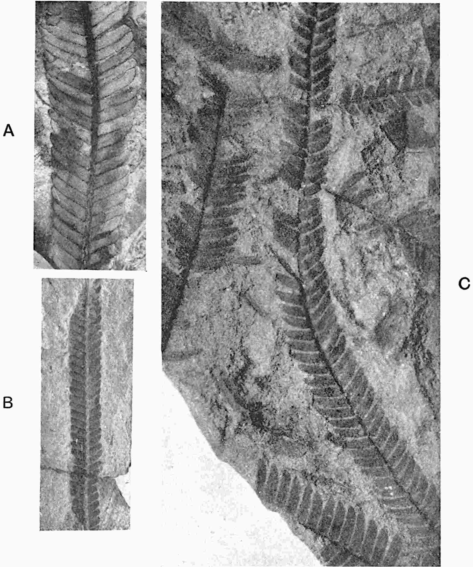 This species was founded by Zeiller[1656] on fronds from the Rhaetic of Tonkin reaching a length of 40 cm. and 2–8·5 cm. broad with a rachis 3–4 mm. wide bearing contiguous linear pinnae 1·5–4·5 cm. long and 1·5–3 mm. broad with a more or less contracted base and a rounded or obtusely pointed apex. The pinnae are attached almost at right-angles or at an angle of 60°–80°. There is a clearly defined midrib.