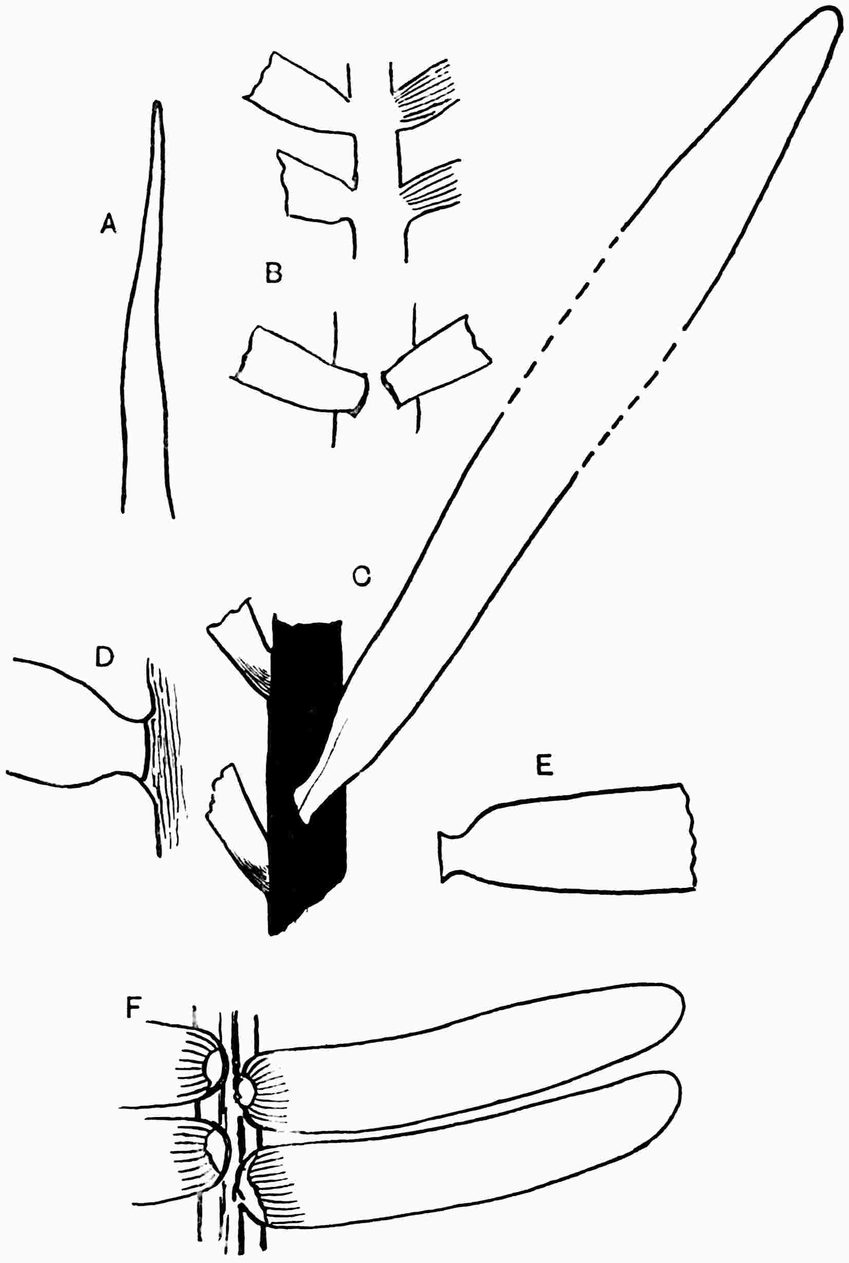 This Wealden species, named by Dunker[1566] Pterophyllum Goeppertianum, agrees in habit with some of those to which reference is made under O. Bechei, e.g. O. linearis Halle, and represents a type of the genus with unusually narrow pinnae (fig. 603, A). The auriculate form of the lamina is feebly developed; the linear-lanceolate pinnae are occasionally falcate and have acute apices; as in many other species they were apparently deciduous. It is by no means easy to distinguish some of these fronds from specimens included in Ptilophyllum pecten.