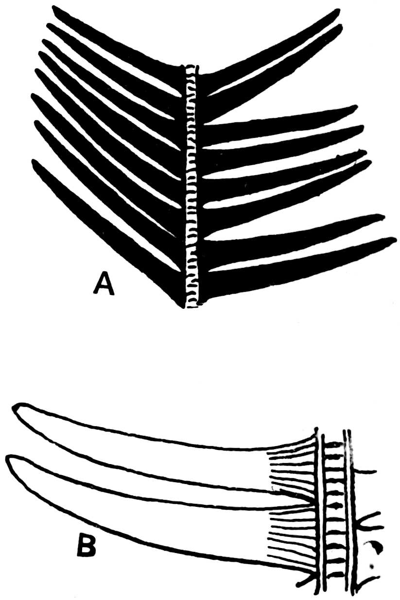The fronds of this Cenomanian species from the West of Greenland reach a breadth of 16 cm.; the rachis, 1 cm. broad, has two 563parallel ridges on the upper surface and to these are attached at a wide angle the broad bases of narrow linear pinnae reaching a length of 9 cm. and a breadth of 2–3 mm. (fig. 617). The pinnae are thick and separate and each has a double ‘midrib’ consisting of two parallel lines (fig. 617, B) which are occasionally replaced by one. The so-called double ‘midrib’ represents the two prominent ridges bordering the groove. The stomata, confined to the median groove, are approximately circular and the short epidermal cells have sinuous walls[1648].