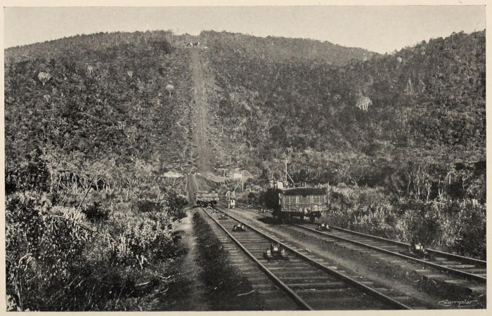 As we stood round the log-fire at evening, the thunder and lightning roared and flashed; and then down came the rain and pelted hard all night. One of the tents was quite flooded; the bed and furniture were rescued and the occupant moved into another’s tent pitched on slightly higher ground. We had arrived in the rainy season, and were told that we must not be surprised if we got a daily soaking. It rather damped one’s enthusiasm for camping out and cycling. This district is called the Kidong Escarpment, and is a ledge of land that suddenly drops[10] some 500 feet. The railway takes a circuitous route to avoid this drop, but at that time a most elaborate temporary line had been laid down the precipitous bank, the cars being worked by cables. One had here an example of the almost insurmountable difficulties that faced the engineers of the Uganda railway, difficulties emphasised by the fact that all material required had to be imported from India or England. Viaducts, some of which are of gigantic height, frequently connect rock to rock, and along these the train has cautiously to pass. At other times the brave little locomotive pants and gasps as it toils along with its burden; now and again it stops to gain breath, then it goes on again, climbing, ever climbing, till it has reached an altitude of 7,000 feet.