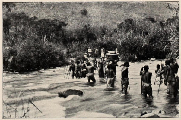 After moving off again and descending very precipitately to the level of the lake, the heavy rains were found to have made marching exceedingly difficult. We had to plough through thick black mud till we reached Port Florence, a distance of twenty-one miles. At one point on the road a stream about thirty yards wide had to be waded, as our porters were unavailable for carrying, having all gone on in front. The water in some parts was a foot deep, and it was by no means an easy thing getting through it when there were inches of mud from which the boots very reluctantly parted.