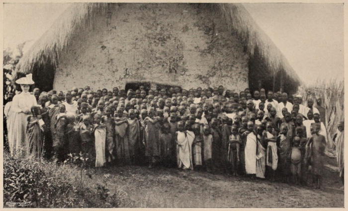 One of these events took place after we had been in the country only a few months, when we were decidedly new to the way things were managed out here, and still retained a fair amount of the provincialism of home training; so when a teachers’ conference was announced we conjured up in our minds a kind of forthcoming Mildmay or Keswick Convention on a small scale, but the arrangements took a slightly different form. The first day opened with a big feast to all the workers. The dispensary was converted for the day into the banquetting hall; the entrance was draped in gaudy native cloths, and the floors of the two rooms were carpeted with banana leaves. The men were allocated to one room and the women to the other. Long before the hour of the feast the guests had arrived and packed themselves as closely together as was possible in circles of seven or eight, the King and his chiefs forming one of the groups. An ox had been killed for the feast; it was boiled in banana leaves and served up with quantities of unsweetened, cooked bananas. Prodigious piles were placed in the centre of each circle of guests, and then business began! Off came their top draperies or coats, and with bare arms all eagerly outstretched towards the food they dived into their food with astonishing rapidity and energy. The banana mash was rolled round the fingers into balls and stuffed down their throats without any regard being given to mastication. The King and chiefs seemed to momentarily forget their dignity, and ate till the perspiration rolled down their faces. Tea was served round in kettles; every available cup, mug, basin and jug on the station had been collected together for the use of the guests—and the two-quarts jugs were far more popular than afternoon tea cups.