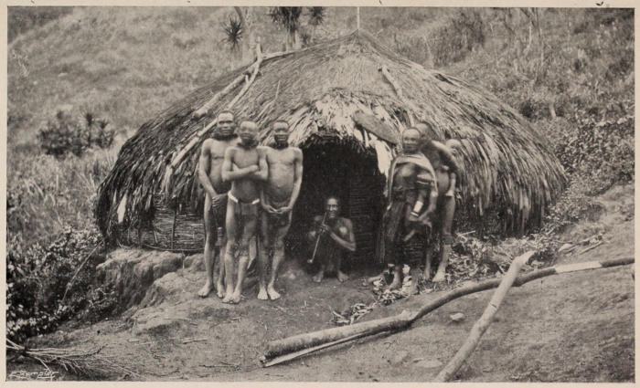The so-called village at which we halted was a collection of three tiny circular huts, built of poles packed as closely together as possible. Round and outside these was tied a thick padding of dried banana bark, leaves, and saplings, as protection from the gales and storms that blew down from the snows and whistled round these little dwellings.