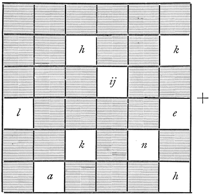 Omtrent de plaats van vertrek en omtrent de bestemmingsplaats van het briefje geen enkel woord. Wat die achttien woorden betreft, die ieder uit een gelijk aantal letters samengesteld waren, zoude het mogelijk zijn, de beteekenis daarvan te weten te komen zonder den sleutel te kennen? Dat was al zeer onwaarschijnlijk, tenzij een hunner een behendig oplosser van raadsels mocht heeten en dan moest nog het geval bestaan dat het schrift ontraadselbaar was. [15]