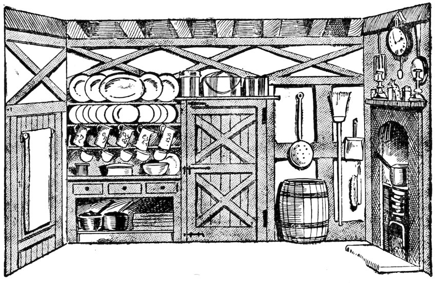 The earnest beginner will no doubt desire to adapt his designs to the play to be represented, but he will usually find very little guidance in the author’s directions. Such directions are scant and laconic, except where the position of a door, window, or fireplace is concerned. This reticence of authors is a blessing rather than a restriction, for such directions as ‘Interior of a cottage,’ ‘A drawing-room,’ ‘A stile by a cornfield,’ ‘A woodland stream,’ give the scene painter a free hand in depicting that which his fancy may dictate. A number of the illustrations in this book will be found useful as suggestions for exteriors and interiors suitable for a goodly collection of domestic plays dealing with home life, but where, as in many of Shakespeare’s plays, the scenario lies in Italy and other parts of Europe, or as in The Only Way and The Scarlet Pimpernel, Paris of the Revolution is dealt with, some attempt must be made to get local colour or the effect will be ludicrous. There are occasions where one need not be too particular. For instance, a Baronial Hall covers a long period of English History; it can even be made quite modern when the play deals with personages of ancient lineage, but the amateurs we saw who depicted a stirring incident in the Soudan war inside a Dickensian cottage, required too elastic an imagination from the audience. Where local colour must be got, the scene painter should look up some private prints or illustrations of the period, or, where possible, good 32pictures of the actual incidents in the play, an easy matter in the case of Shakespeare.