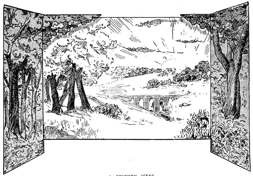 33Landscape will more easily pass muster with the majority of onlookers, but intelligence in designing outdoor scenery is keenly appreciated by those who know, and a landscape that coincides with the locality of the play stamps the painter as an artist rather than an amateur. English landscape can take care of itself, pictures by Birket Foster, B. W. Leader, Alfred East and others provide excellent material. Scotch scenery should be wilder and more rugged, with masses of rock and heath instead of grass, while Irish landscapes should be depicted as somewhat unkempt in appearance, with small stumpy trees. It should be noted also that the character of the fencing changes, hedges to stone walls, stone walls to banks and ditches, and so forth. Where foreign environment is concerned, photographs must be studied, but Italian gardens, which are very popular as back cloths, can be seen copied in many English county mansion domains. With their dark masses of trees, many of the poplar order standing in relief against the sky, suggestions of statuary, fountains, and balustraded terraces, they have a decidedly foreign appearance and are undeniably effective.