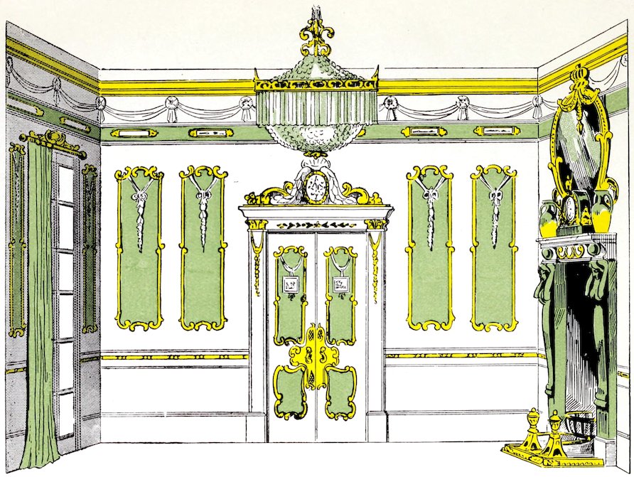 When the whole of a formal interior is set up in line and shadow, the artistic part of the work comes in, in the tinting and colouring, and imitating of gold work, for however well drawn out such a scene may be, the finishing work can be delicately beautiful or crudely coarse, according to the painter’s idea of colour.