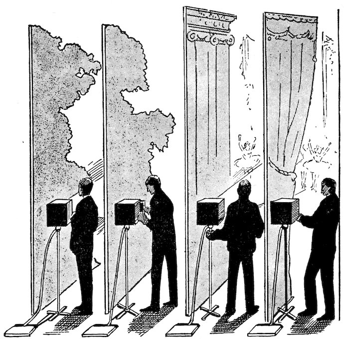 A thunder storm is imitated by the sounds of wind, rain and thunder combined. The thunder is 66produced from a sheet iron hung from the flies. At the bottom of it there is a handle which the thunder-maker grasps. He shakes the sheet as well as he can, and a sound of booming thunder is heard in the auditorium.