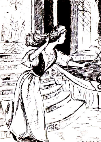 Ŝi forkuris el la balĉambro kaj rapidege malsupreniris la ŝtuparon. Sed ŝiaj vestoj ĉiuj fariĝis vestaĉoj antaŭ ol ŝi eliris el la palaco, kaj ŝi perdis unu el siaj vitraj pantofloj.