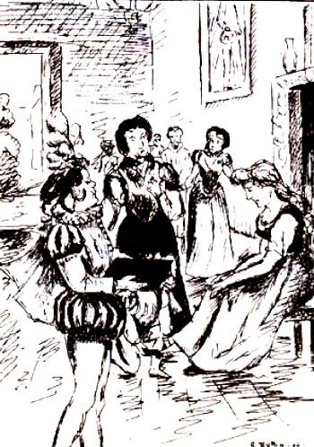 Oni ne povas imagi la koleron kaj envion de ŝiaj fratinoj; sed subite la bapto-patrino feino aperis, denove tuŝis Cindrulinon per sia vergeto, kaj ŝia robaĉo ŝanĝiĝis en belegan silkan robon, tute decan por edziniĝa festo.