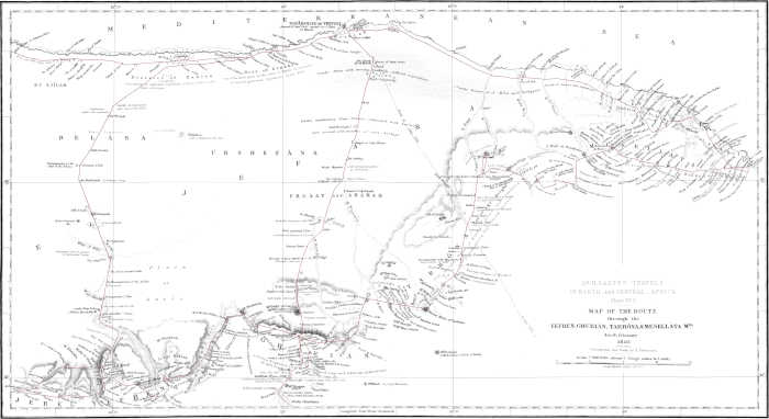 During my three years’ travelling I had ample opportunity of testing the efficacy of British protection; I experienced the kindness of all Her Britannic Majesty’s consuls from Tangiers to Brúsa, and often enjoyed their hospitality. It was solely their protection which enabled me to traverse with some degree of security those more desert tracts through which I wandered. Colonel Warrington, Her Majesty’s consul in Tripoli, who seems to have had some presentiment of my capabilities as an African explorer, even promised me his full assistance if I should try to penetrate into the interior. Besides this, my admiration of the wide extension of the British over the globe, their influence, their language, and their government, was such that I felt a strong inclination to become the humble means of carrying out their philanthropic views for the progressive civilization of the neglected races of Central Africa.