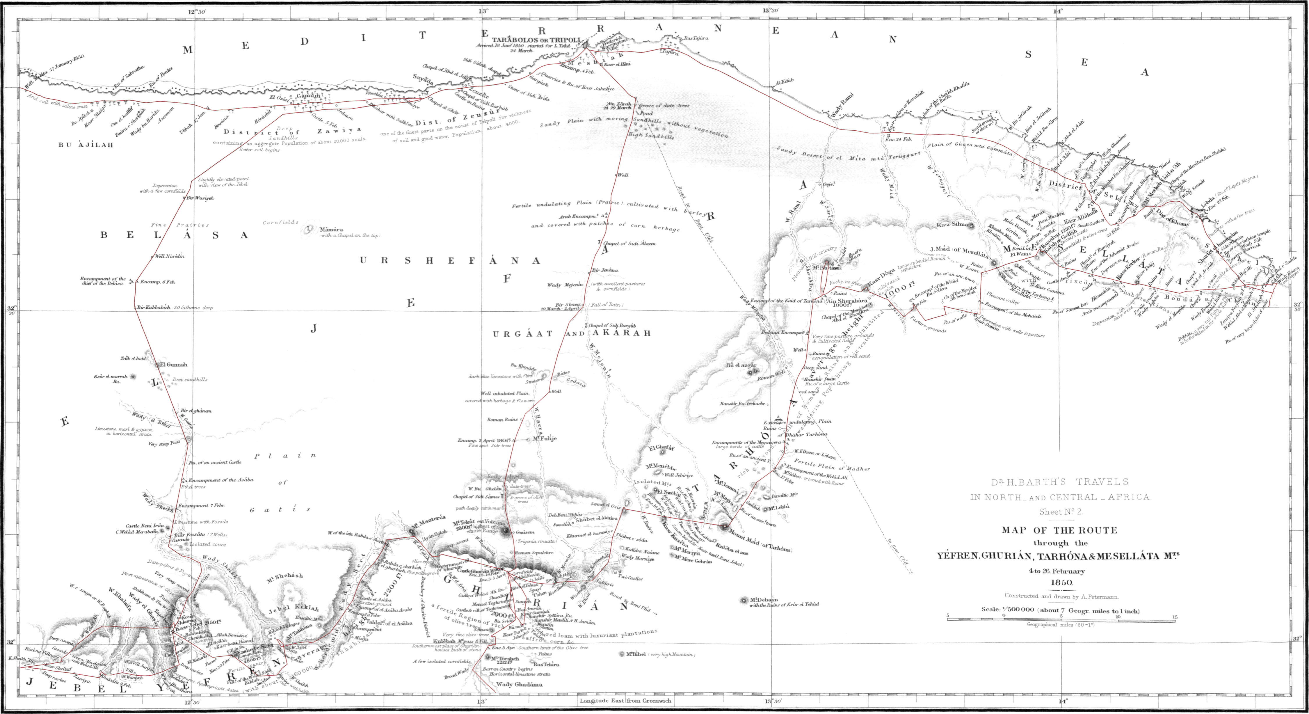 I have given a full description of my preparatory excursion through the mountainous region round Tripoli; for though this is not altogether a new country, anyone who compares my map with that of Lyon or Denham, will see how little the very interesting physical features of this tract had been known before, while, at a time when the whole Turkish empire is about to undergo a great transformation, it seems well worth while to lay also the state of this part of its vast dominions in a more complete manner before the European public.