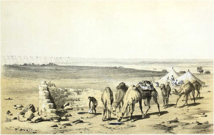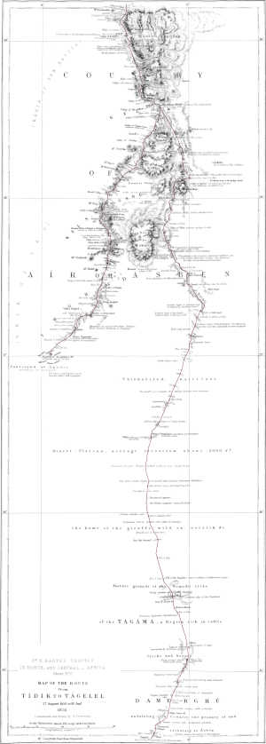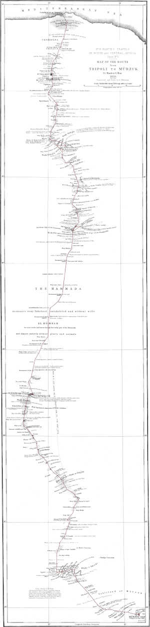 It was a generous act of Lord Palmerston, who organized the expedition, to allow two foreign gentlemen to join it instead of one. A sailor was besides attached to it; and a boat was also provided, in order to give full scope to the object of exploration. The choice of the sailor was unfortunate, and Mr. Richardson thought it best to send him back from Múrzuk; but the boat, which was carried throughout the difficult and circuitous road by Múrzuk, Ghát, Aïr, and Zínder, exciting the wonder and astonishment of all the tribes in the interior, ultimately reached its destination, though the director of the expedition himself had in the meanwhile unfortunately succumbed.