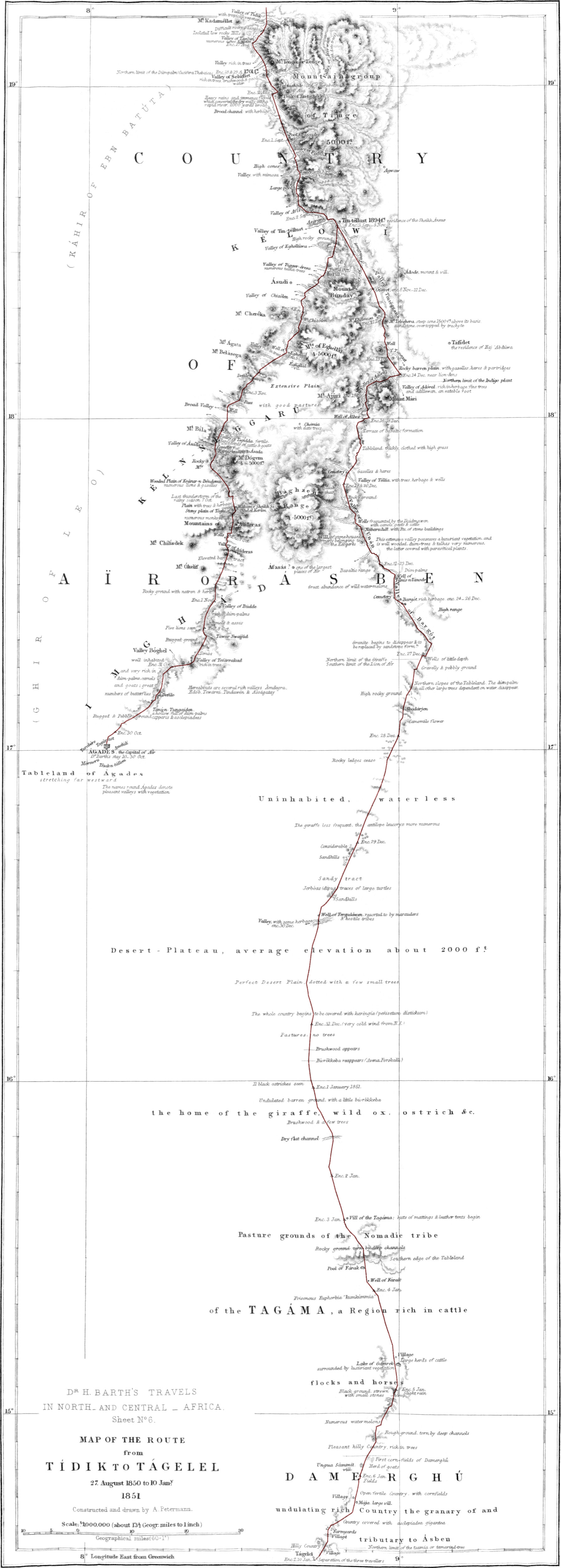I had the good fortune to see my discoveries placed on a stable basis before they were brought to a close, by the astronomical observations of Dr. Vogel[1], who was sent out by Her Britannic Majesty’s Government for the purpose of joining the expedition; and I have only to regret that this gentleman was not my companion from the beginning of my journey, as exact astronomical observations, such as he has made, are of the utmost importance in any geographical exploration. By moving the generally-accepted position of Kúkawa more than a degree to the westward, the whole map of the interior has been changed very considerably. The position assigned by Dr. Vogel to Zínder gives to the whole western route, from Ghát through the country of Ásben, a well-fixed terminating point, while at the same time it serves to check my route to Timbúktu. If, however, this topic be left out of consideration, it will be found that the maps made by me on the journey,[xv] under many privations, were a close approximation to the truth. But now all that pertains to physical features and geographical position has been laid down, and executed with artistic skill and scientific precision, by Dr. Petermann.