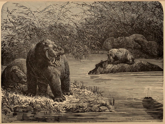 [13] The Anyasa name for a hippopotamus is mvu, the Yao name is ndomondo. The first word is undoubtedly taken from the snorting of the animal, while the second word may be taken from the splash with which the animal returns to the river after feeding on the bank.