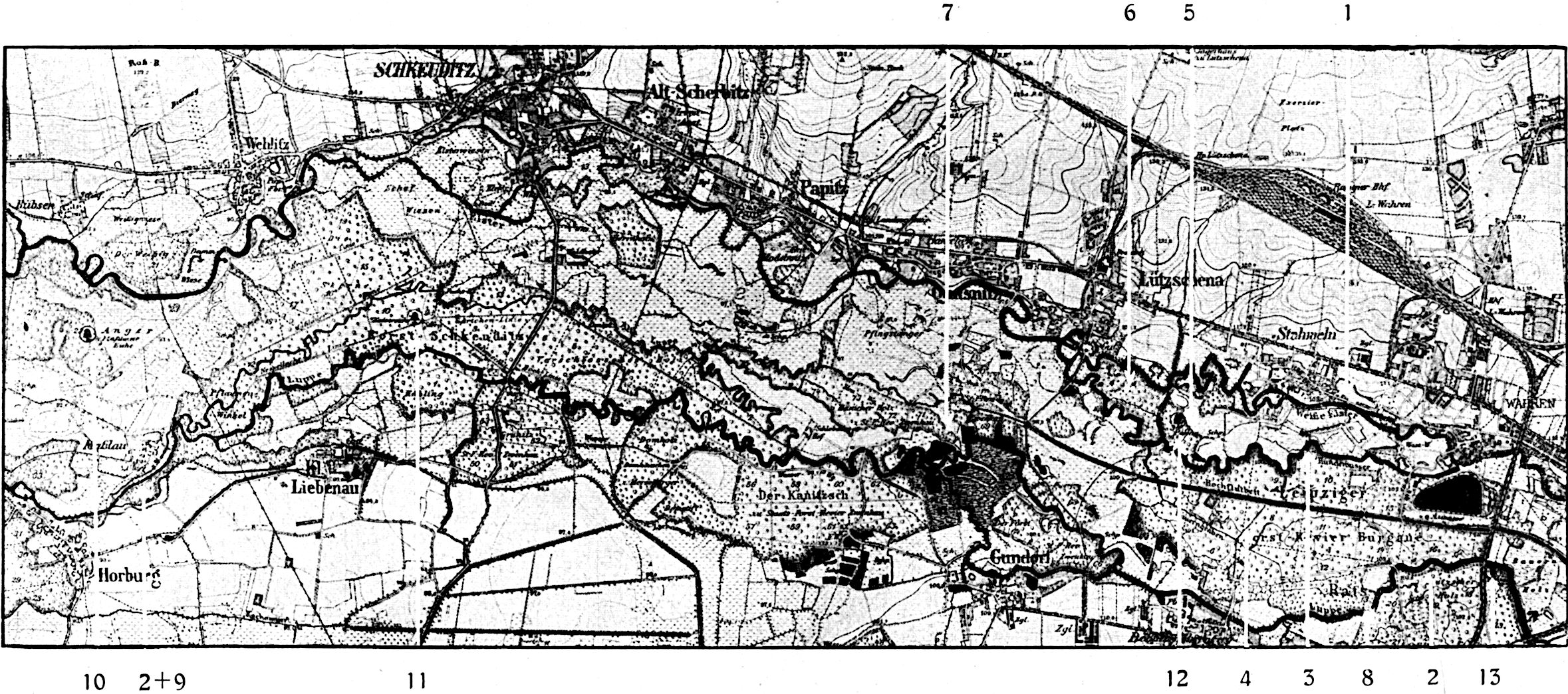 Erst in der Niederung fließt der Strom in majestätischer Breite und altersträger Ruhe ohne besondere Richtungsänderung dahin. Nach starkem Herbstregen oder durch die Schmelzwässer des Frühlings tritt er weit über seine Uferränder hinaus und setzt feinkörnige fruchtbare Verwitterungsmassen ab, die wir als Aulehm bezeichnen, und welche aus Ton und feinem Sande bestehen. Nur dann weicht der Strom der Niederung von seiner eingeschlagenen Hauptrichtung ab, wenn sich ihm leichtgewellte Höhenzüge, wie bei der Elbe der Fläming, entgegenstellen, oder wenn seitliche, wasserreiche Zuströme ihm eine andere Richtung aufdrängen, wie dies bei der Weser durch die Aller geschieht. Dort, wo mehrere gleichgerichtete Flüsse sich auf engem Raum vereinigen, wo also ein engmaschiges Flußnetz gewebt ist, wird sich die günstigste Gelegenheit zur Auwaldbildung finden, und hier dürfen wir auch typische Auenwälder erwarten. In Sachsens Nordwesten, in Leipzigs Umgebung, ist ein solches Gebiet geschaffen durch den Zusammenfluß von Elster, Parthe, Pleiße und Luppe (Abb. 2), und die malerische Gruppierung verschiedenartigster Laubbäume am Hundewasser gibt uns einen Begriff von den Schönheitswerten solcher Bestände.
