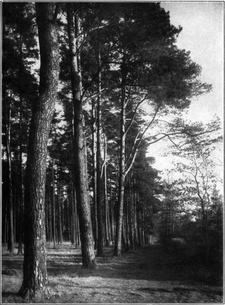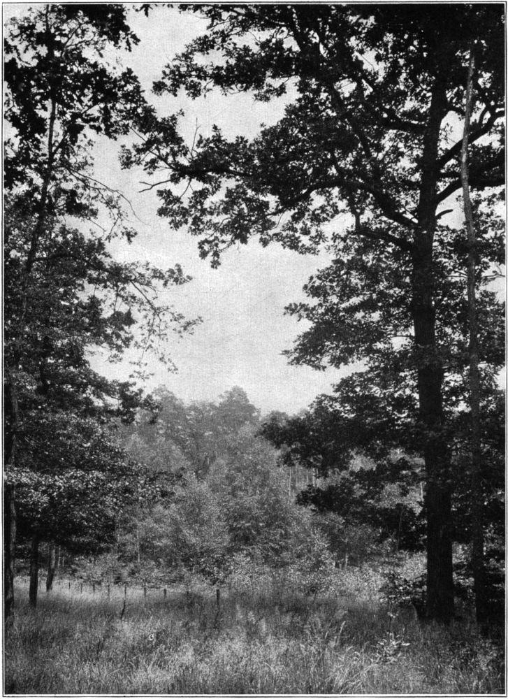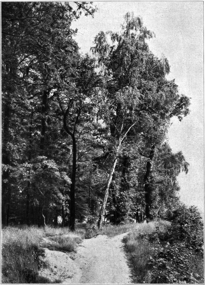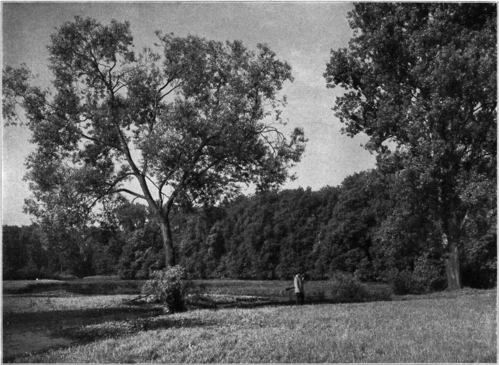 In der norddeutschen Niederung erlangen naturgemäß die periodischen Überschwemmungsgebiete ihre weiteste Ausdehnung und erzeugen, wie Drude sagt, scharfe Gegensätze zwischen Heide- und Auenwald. Hier werden auch die Flußauen, soweit der Eisgang das Aufkommen von Baumbeständen hindert, von sumpfigen Grasfluren und Grünmooren begleitet, wie uns die Abbildung 12 eines Flußtales in Posen durch den reichen Bestand an Wollgras mit seinen weißleuchtenden Fruchtfahnen dartut. Am Horizont erkennt man den dunkelgrünen Wall des Auenwaldes, soweit nicht dauernd nasses Gelände einen Bruchwald schafft, einen Sumpfwald aus Erlen und stattlichen Weiden, durchsetzt mit Birken und Schwarzpappeln[2].