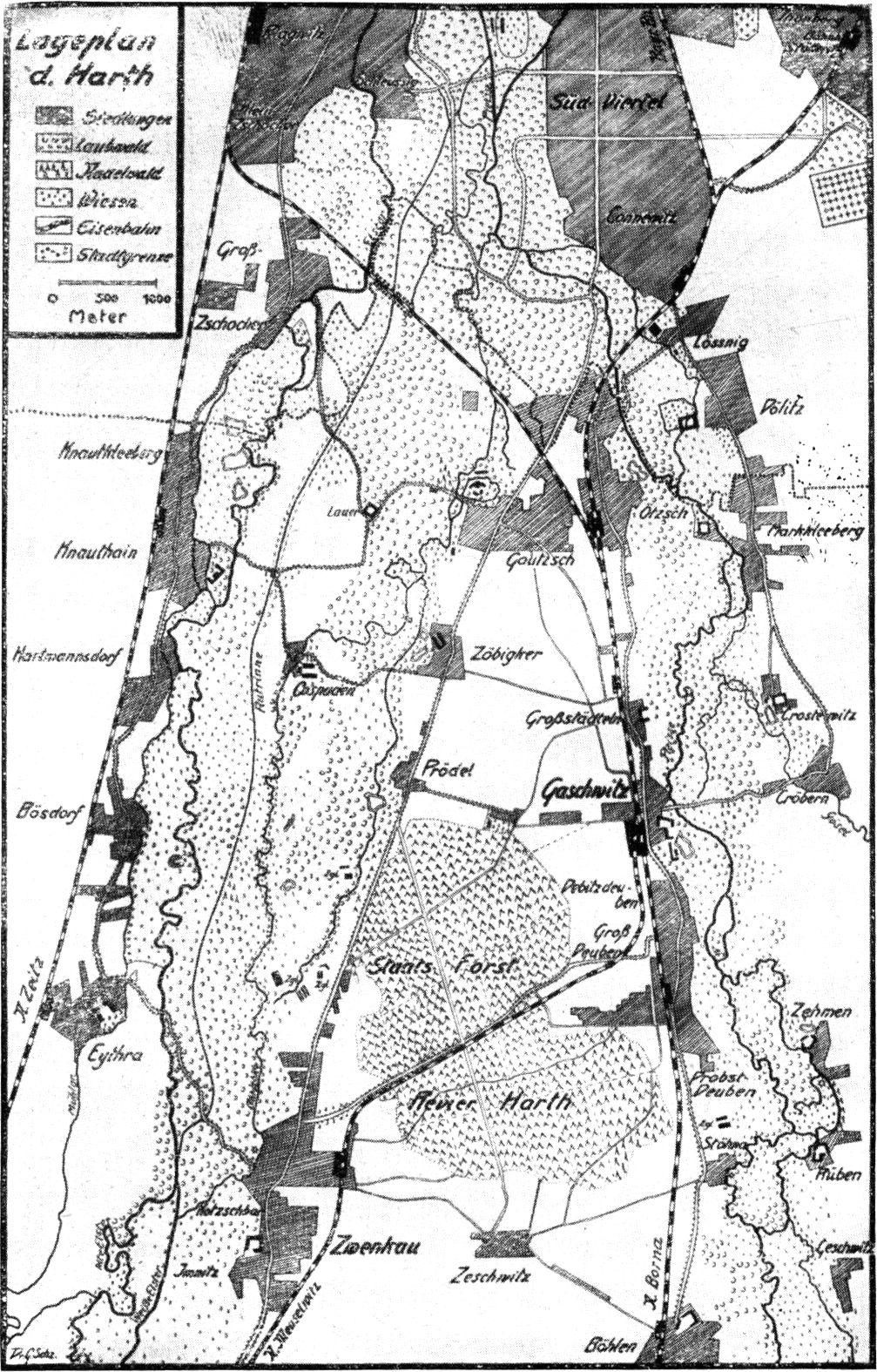 Innerhalb des Leipziger Landes fehlt es fast völlig an umfänglichen Ortschaften, wie sie das Erzgebirge oder die südöstliche Lausitz so zahlreich aufweist, wenn man absieht von den mit Leipzig verwachsenen Industrie- und Arbeiterwohnsitzgemeinden, die indes zum größten Teil in den letzten fünfzehn Jahren und schon vorher um 1890 einverleibt worden sind. So liegt keine Gemeinde von mehr als 10 000 Einwohnern im eigentlichen Leipziger Lande. Merseburg, Eilenburg, Wurzen, auch Borna liegen schon an seinen Grenzen. Städte wie Naunhof, Zwenkau, Delitzsch, denen größtenteils die Industrie ihr Gepräge als Landstadt noch nicht oder nur teilweise genommen hat, und Bauerndörfer überwiegen noch immer, im ganzen betrachtet, die Industrie- und räumlich und ihrer Zahl nach fast auch die Arbeiterwohnsitzgemeinden. Auch Einzelsiedlungen, so häufig im Dresdner Lande und um Hamburg oder Berlin, [296]sind jenseits des Leipziger Stadtgebietes, etwa von der Pleißenaue abgesehen, noch recht selten, z. T. auch wohl infolge der nahen Landesgrenze, die die Stadt im Halbkreis umzieht und manche Verkehrserschwerungen nach wie vor im Gefolge hat, die ungerechtfertigtsten, und in der großen Handelsstadt besonders schmerzlich empfundenen, bekanntlich im Eisenbahnverkehr.