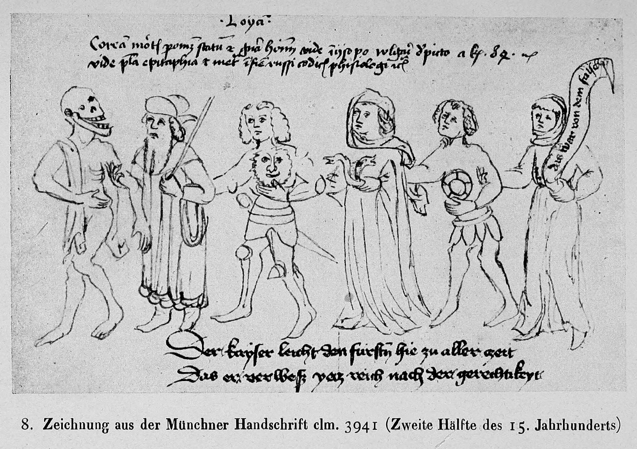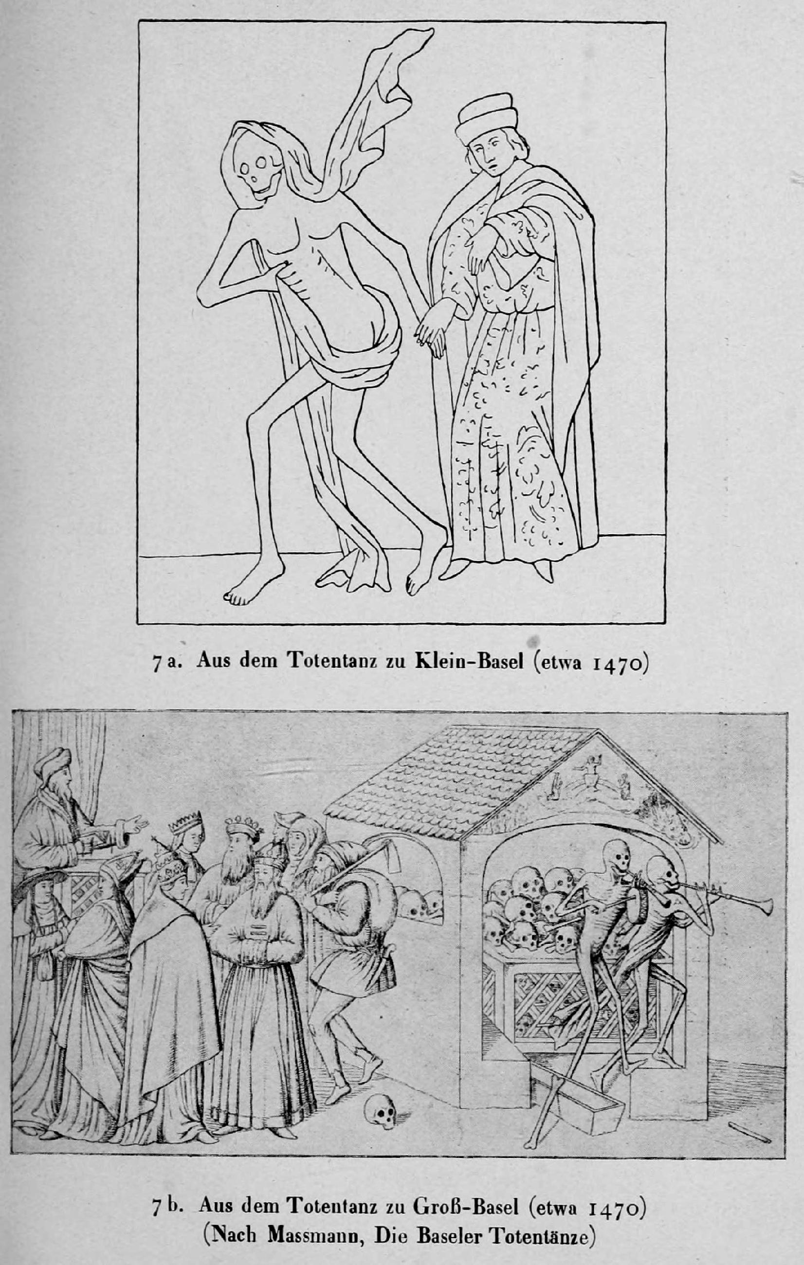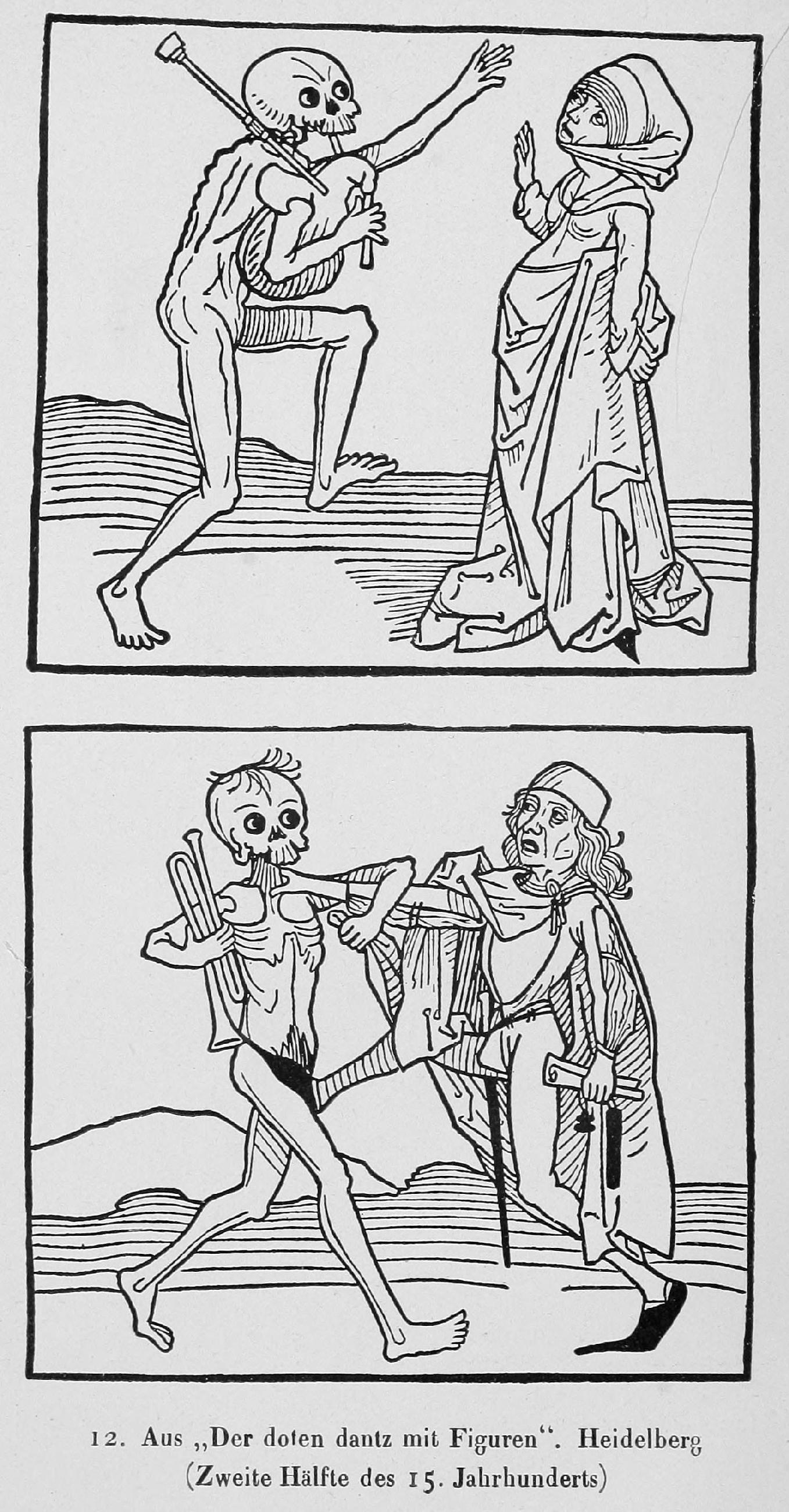 Schon früh fügte man in Frankreich, dann auch in anderen Ländern nach Art der Tituli den Bildern Verse bei, in denen die Lebenden ihr Schicksal beklagten, dann auch die Toten mit Warnungen und Aufforderungen an diese sich wandten. Daneben aber erwuchs ein zweites Gedicht, in welchem nicht der Tote, der Leichnam, sondern der personifizierte Tod die Menschen zum Eintritt in seinen Tanz befiehlt. Dieses Motiv vom Tanze des Todes war genährt durch verwandte Motive aus der Mystik, so daß vielleicht dieser Text aus Deutschland seinen Ursprung nimmt. Auch der neue Dialog vom Tanz des Todes erschien bald unter manchen Bildern, ohne daß der Widerspruch zwischen Darstellung und Wort empfunden wurde.