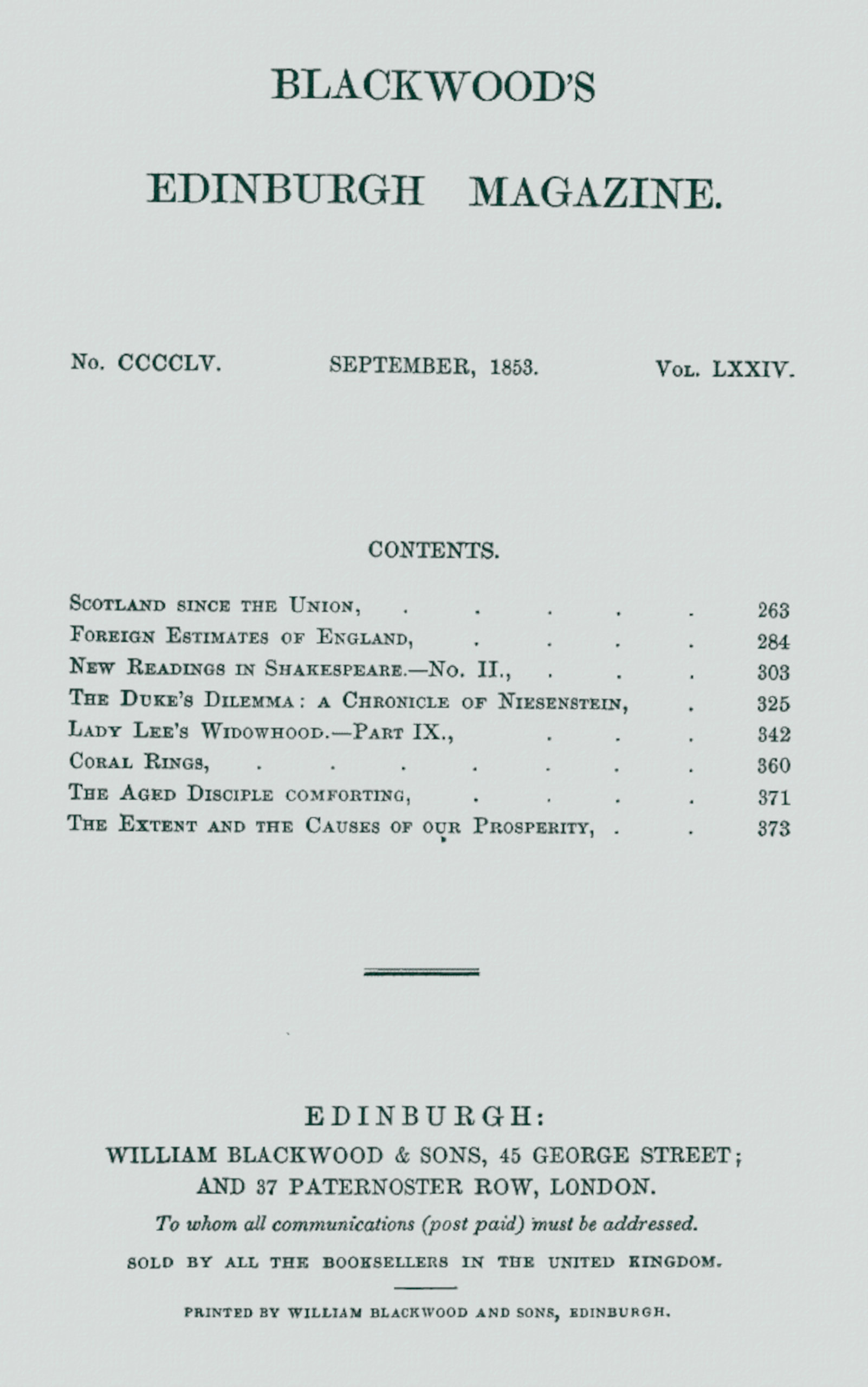 We have the less inclination to enter upon disputed grounds, because the points on which we differ from Mr Burton are not of practical moment. The political intrigues and risings of the last century have not left any permanent effect upon the social condition of the country; but the subsequent blending together of the Lowland and Highland population, and the establishment throughout the country of a uniform administration of the laws, have been productive of the happiest results. So far the changes have wrought well within Scotland. But the great event of last century undoubtedly is the union between England and Scotland, which, often proposed, and long delayed by mutual jealousy and clashing interests, has elevated Great Britain to the foremost rank among the European states.