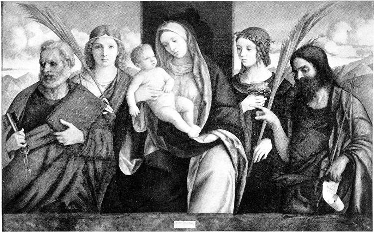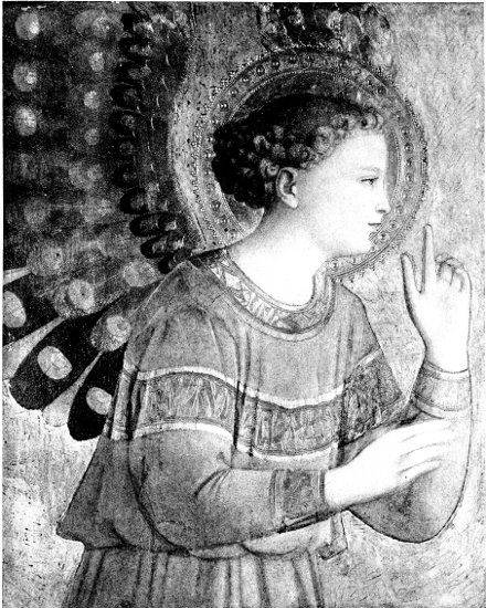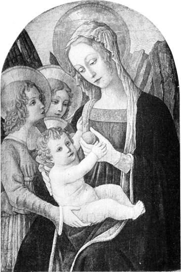 [21] “The introduction of little angels singing vigorously and playing on musical instruments about the Madonna’s throne was a favorite motif of the Umbrian Boccatis. Indeed, angel musicians were represented by artists of all Schools from the Twelfth to the Seventeenth Century. They stand or kneel before the Madonna and Child, or—particularly in Venetian and North Italian paintings—sit on the steps of the throne, playing on lutes, harps, viols, miniature organs, blowing horns and trumpets, striking cymbals and triangles or beating drums and timbrels, and singing their songs of praise and adoration. They make a delightful note of joyousness in representations of the Madonna and Child and are among the happiest creations of painters and sculptors.”—Mediæval and Renaissance Paintings (Fogg Art Museum, Cambridge, 1927).