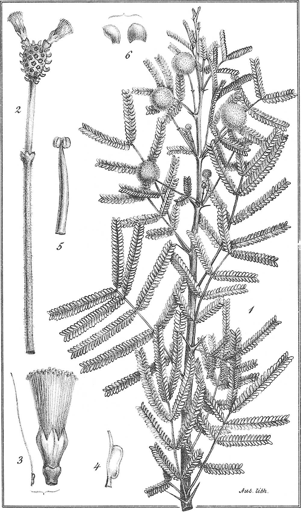 Taf. XV. 1. Ein blühender Zweig mit zwei einjochigen Blättern. 2. Desgl. mit 2-jochigen Blättern. (nat. Gr.) 3. Blüthe und Fruchtknoten. 4. Staubgefäss. 5. Blüthenköpfchen nebst Stiel.